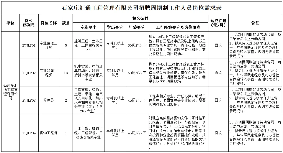 因工作需要现委托石家庄市国经人力资源管理有限公司面向社会公开招聘项目周期制工作人员,现将具体招聘事宜公告如下: