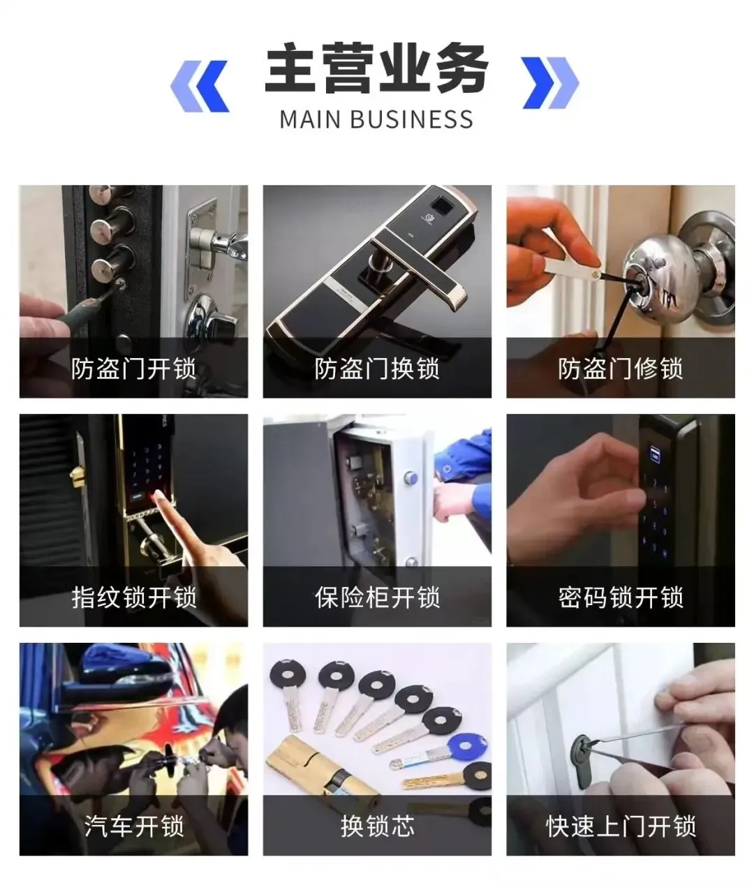 🔓 上门开锁(防盗门锁 / 室内门锁 / 玻璃门锁)🔑 更换锁芯(A级 / B级 / C级防盗锁芯)🚪 安装智能锁 / 指纹锁 / 密码锁🧰 门锁维修(钥匙断锁 / 门锁卡顿 / 锁芯损坏)🚗 汽车开锁 / 配汽车钥匙💼 保险柜开锁 / 文件柜开锁🏢 商铺门锁 / 公司门禁锁维修安装🔐 防盗门锁升级与安全咨询服务