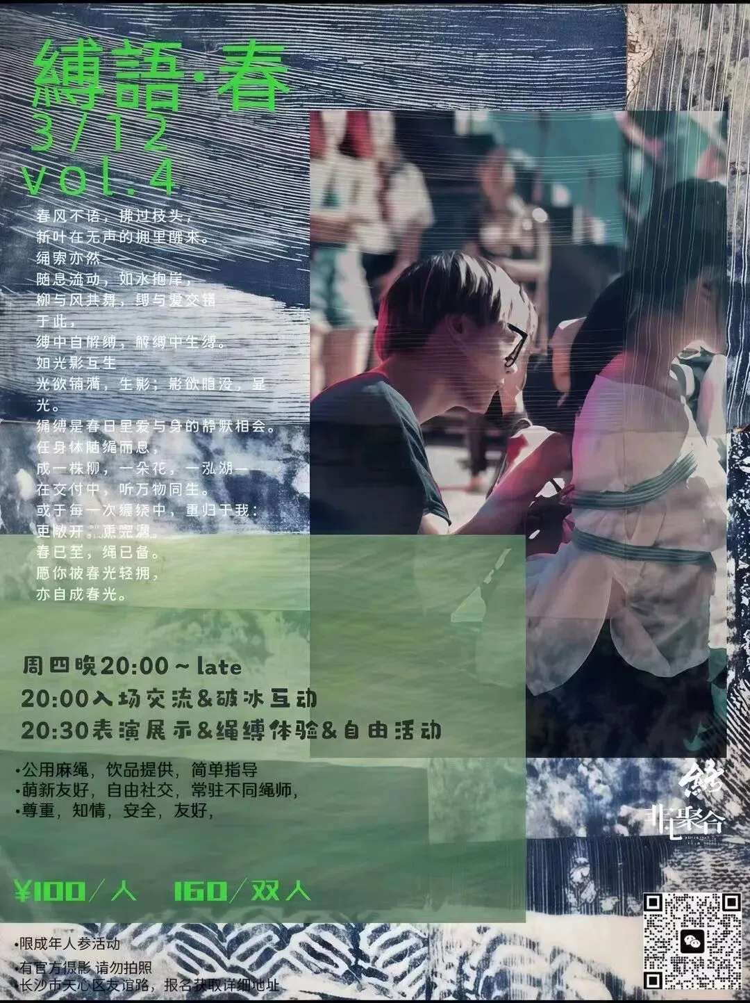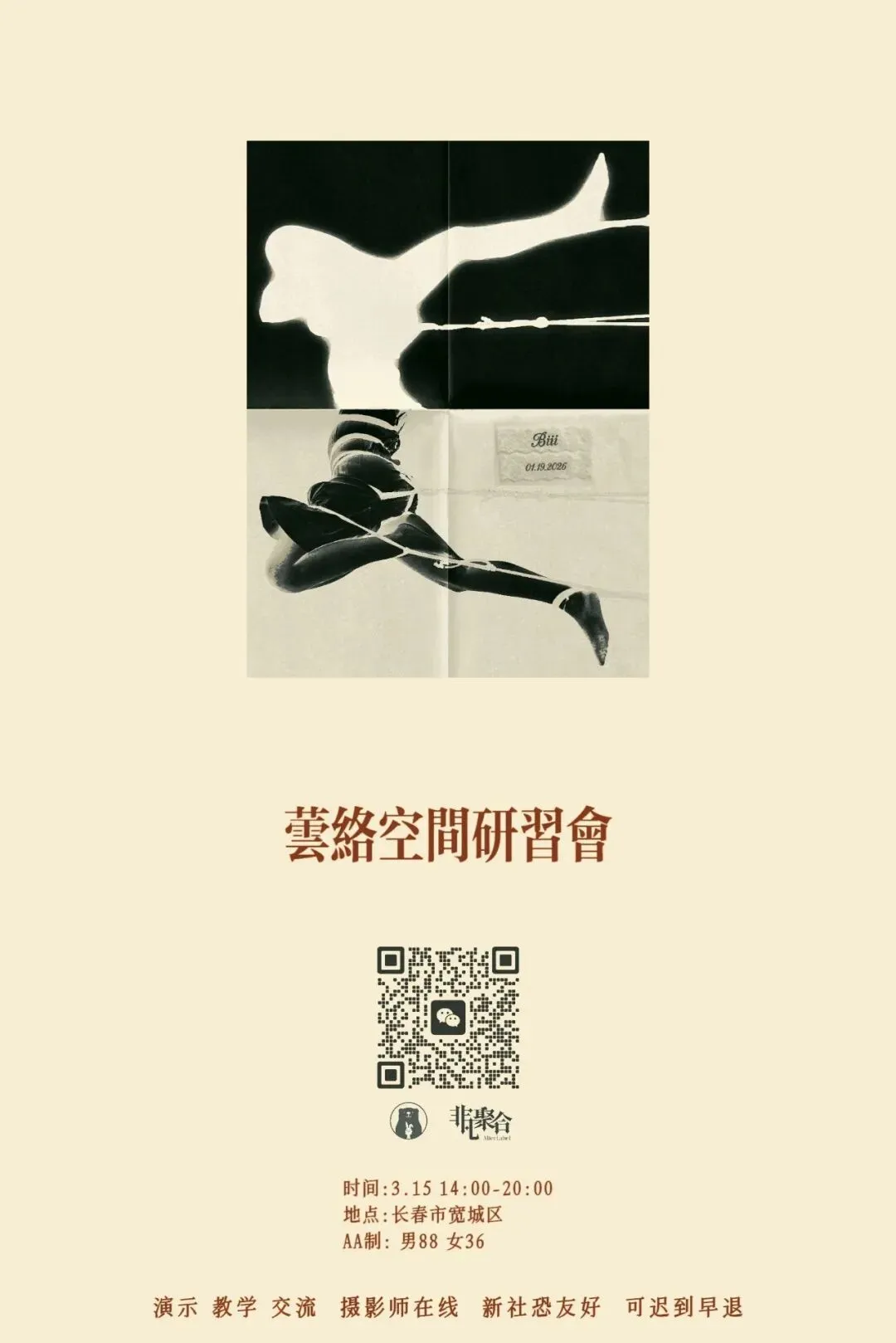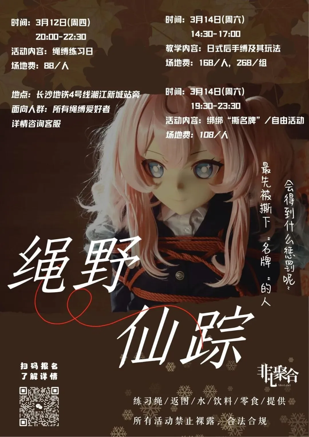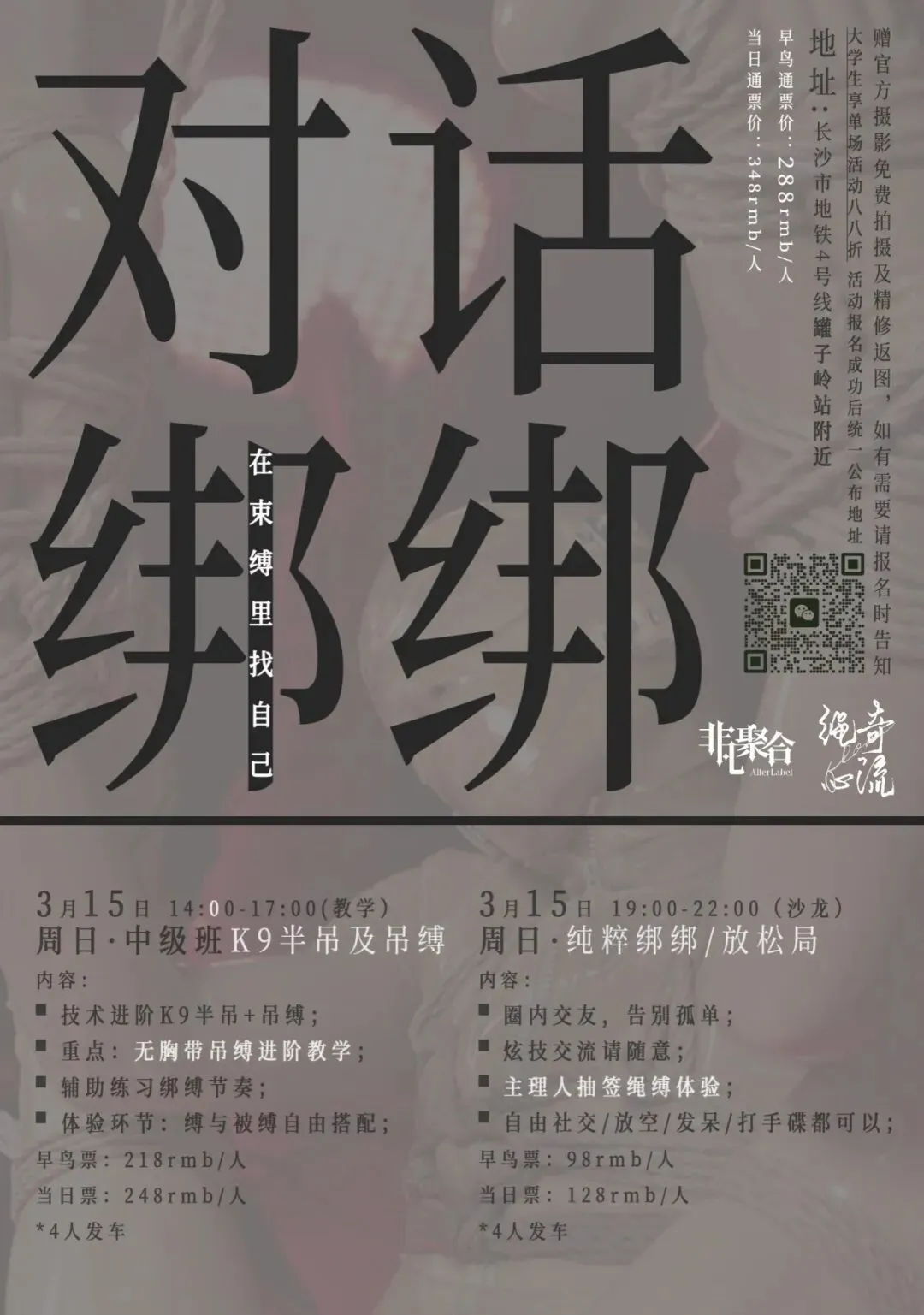 人的心智需要一些迷恋的事物来点亮, 小时候是橱窗里的积木, 一整套漫画书或者是青春懵懂的美好。 如果你已经掌握一部分技巧,感受过绳索在皮肤与心中留下的痕迹,那么这一次,我们往上走。 3月15日下午14:00-17:00,中级班,专注K9半吊与吊缚。重点是无胸带吊缚的进阶技巧,练习绑缚的节奏感,让绳子不只是束缚,而是成为你和对方之间的语言。每人都有机会自由搭配,在缚与被缚之间,找到属于自己的位置。 不赶进度,不设标准答案,只有技术、呼吸,和一点点悬空的勇气。 晚上19:00-22:00,纯粹绑绑放松局。圈内人聚一聚,炫技、发呆、打手碟、抽签体验……都可以,没有主题,只有你舒服的样子。 3月15日,长沙。 半吊半醒,刚刚好。