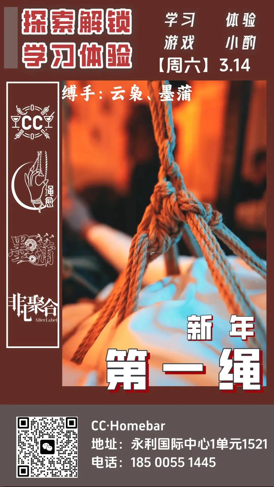 CC本周迎来新年第一绳。周五我们依旧是休闲一些,大家可以随意喝酒,玩玩游戏,主打开心;周六我们开启马年第一次绳活动,缚手是云枭老师和墨蒲老师,欢迎大家来玩~