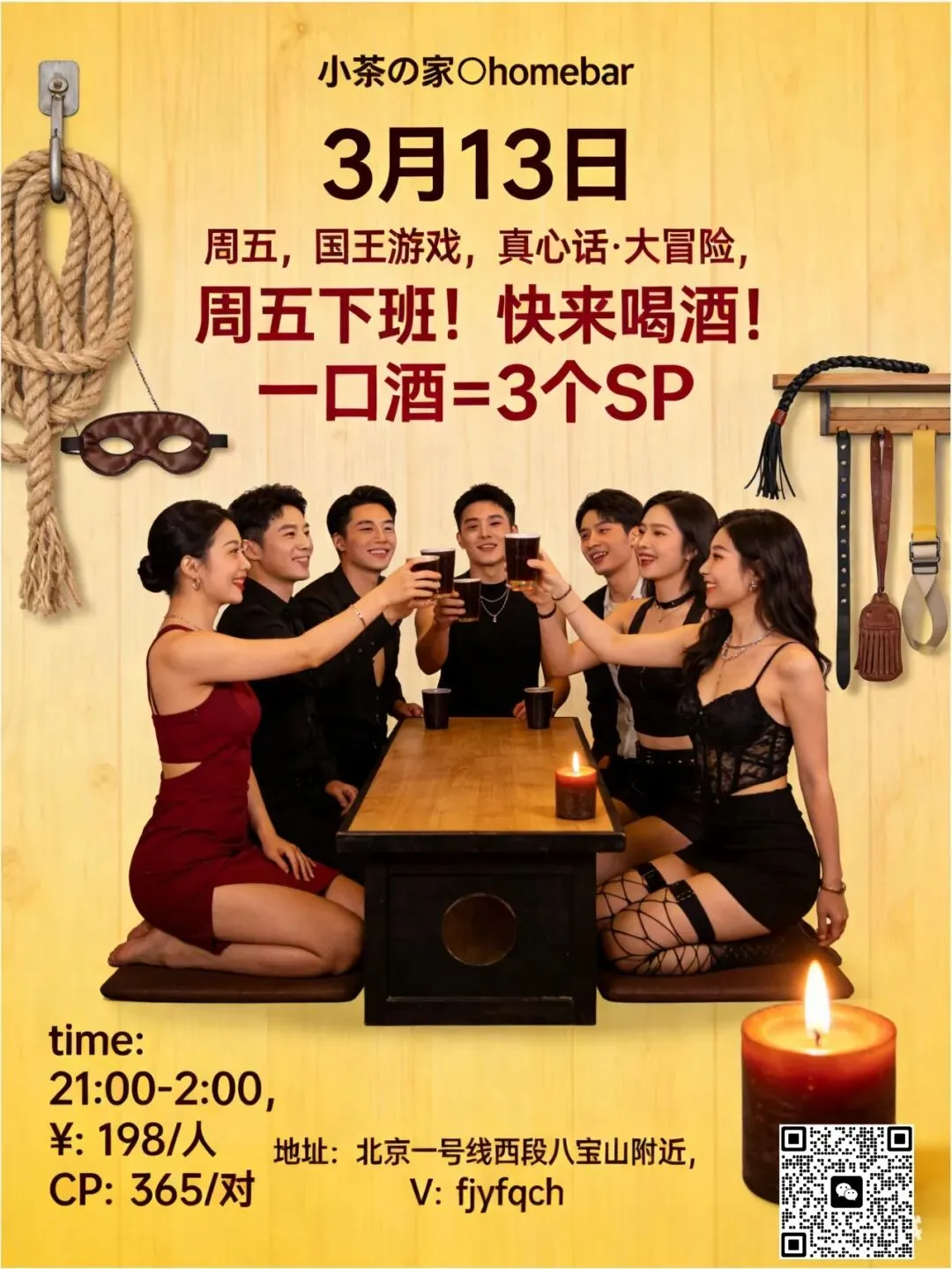 小茶の家⭕内Homebar,位于北京西侧,一处为圈内同好打造的安心客厅。周六傍晚,这里会点亮温暖的社交时光。 女性友好,宠物友好,男生卡丑卡油腻哦。在DM的欢乐引导下,你可以通过轻松的破冰游戏结识新友,或是沉浸于玩绳、软开、主题酒会、深夜故事会等丰富活动中。 我们恪守绿色健康的准则,旨在为圈内好友提供一个安全、舒适且纯粹放松的线下归属地。(门票包含酒水小食畅饮)