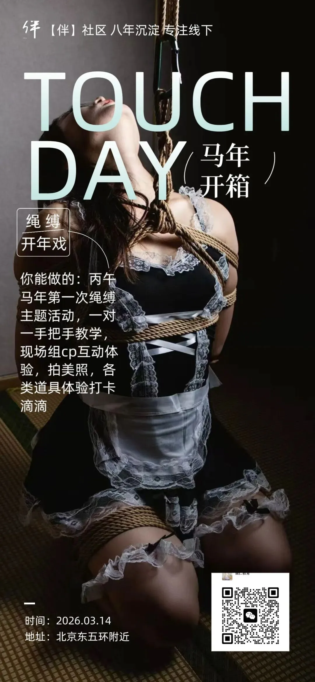 北京【伴】社区3月14日活动 沉淀八年,优质真实,专注线下,小众文化爱好者社区 时间:周六下午到晚上 地点:东五环附近(具体地址报名后告知) 主题:《马年·开箱》 你能做的:丙午马年第一次绳缚主题活动,一对一手把手教学,现场组cp互动体验,拍美照,各类道具体验打卡滴滴