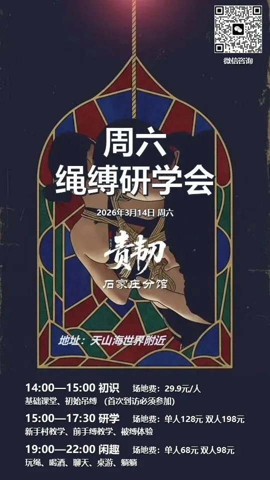3.12(四)19:00-22:00 3.14(六)14:00-17:30、19:00-22:00 3.15(日)15:00-20:00 【责韧空间石家庄分馆】 周四练绳会。 周六绳缚研学活动分为初识、研学、闲趣,欢迎真心热爱的朋友一起来愉快玩绳! 周日绳缚探访日,让我们回归对绳缚的好奇心与探索欲!