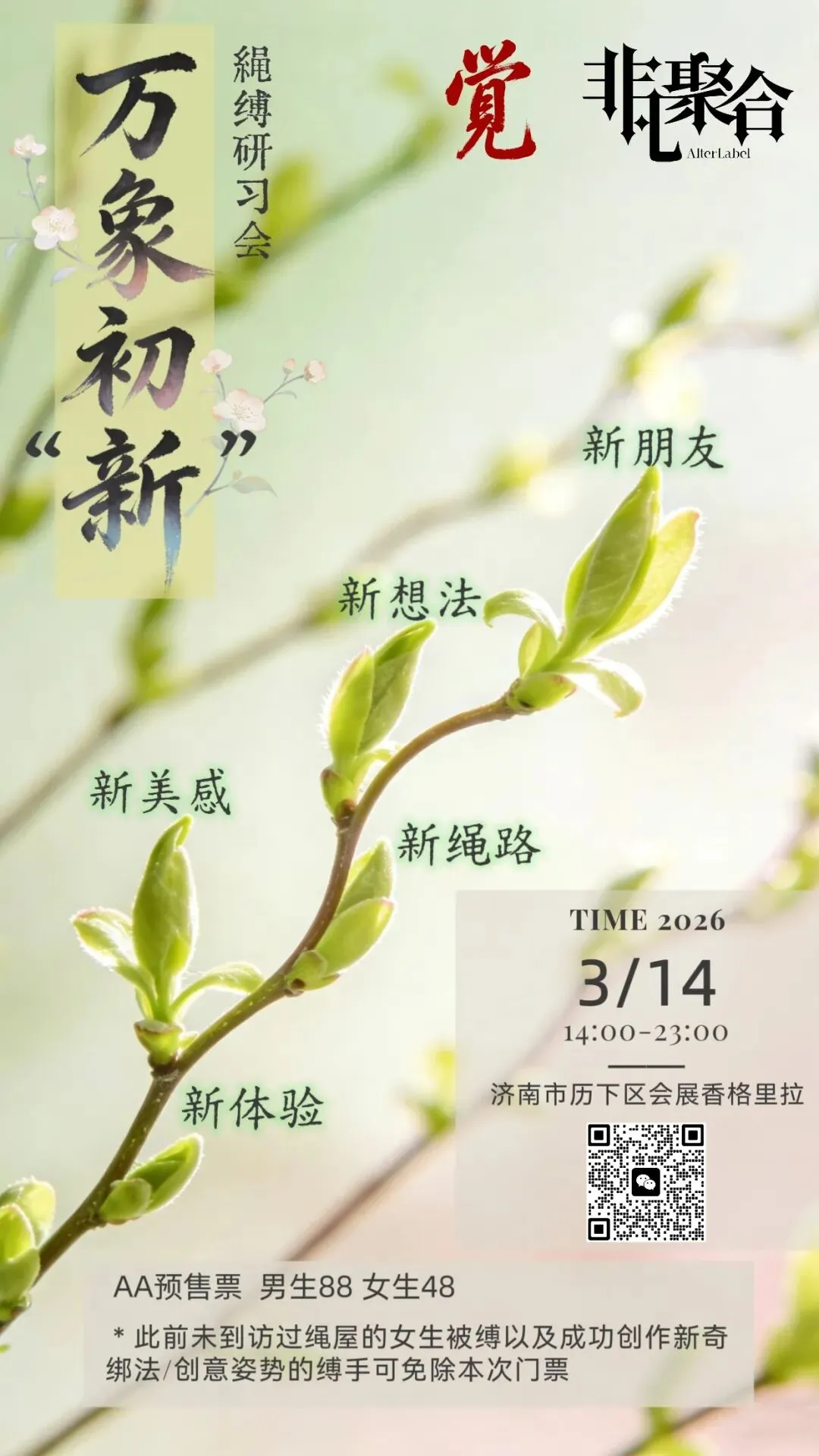🌿 万象初“新”·绳缚研习会 玩腻了老一套,想搞点新东西?没人陪伴练手,想结交新朋友? 春芽破土,绳绪新生。觉·Studio特别活动,让手中绳索焕发出新的生机,3月14日(本周六)与您相约,定让您不虚此行。