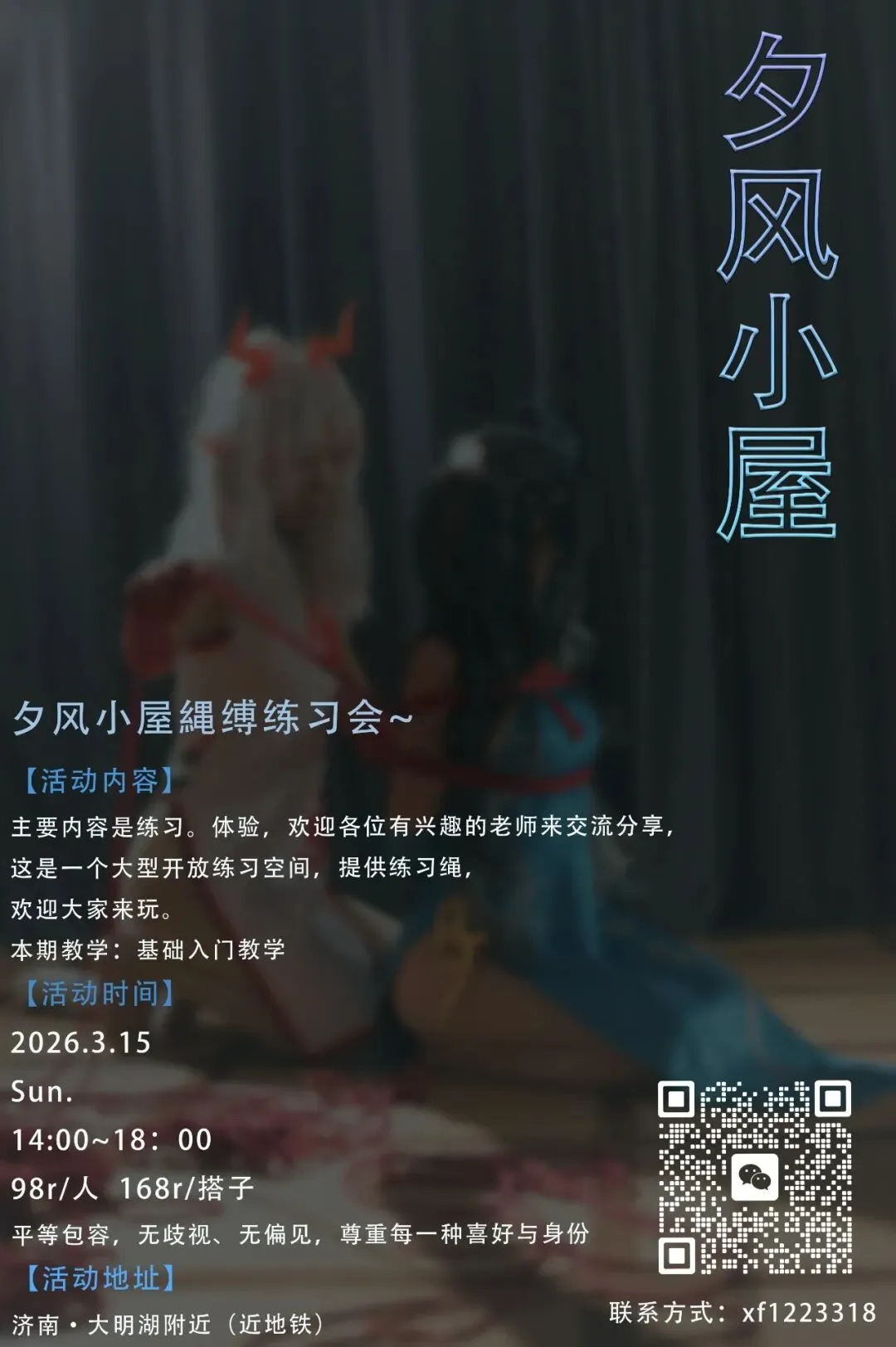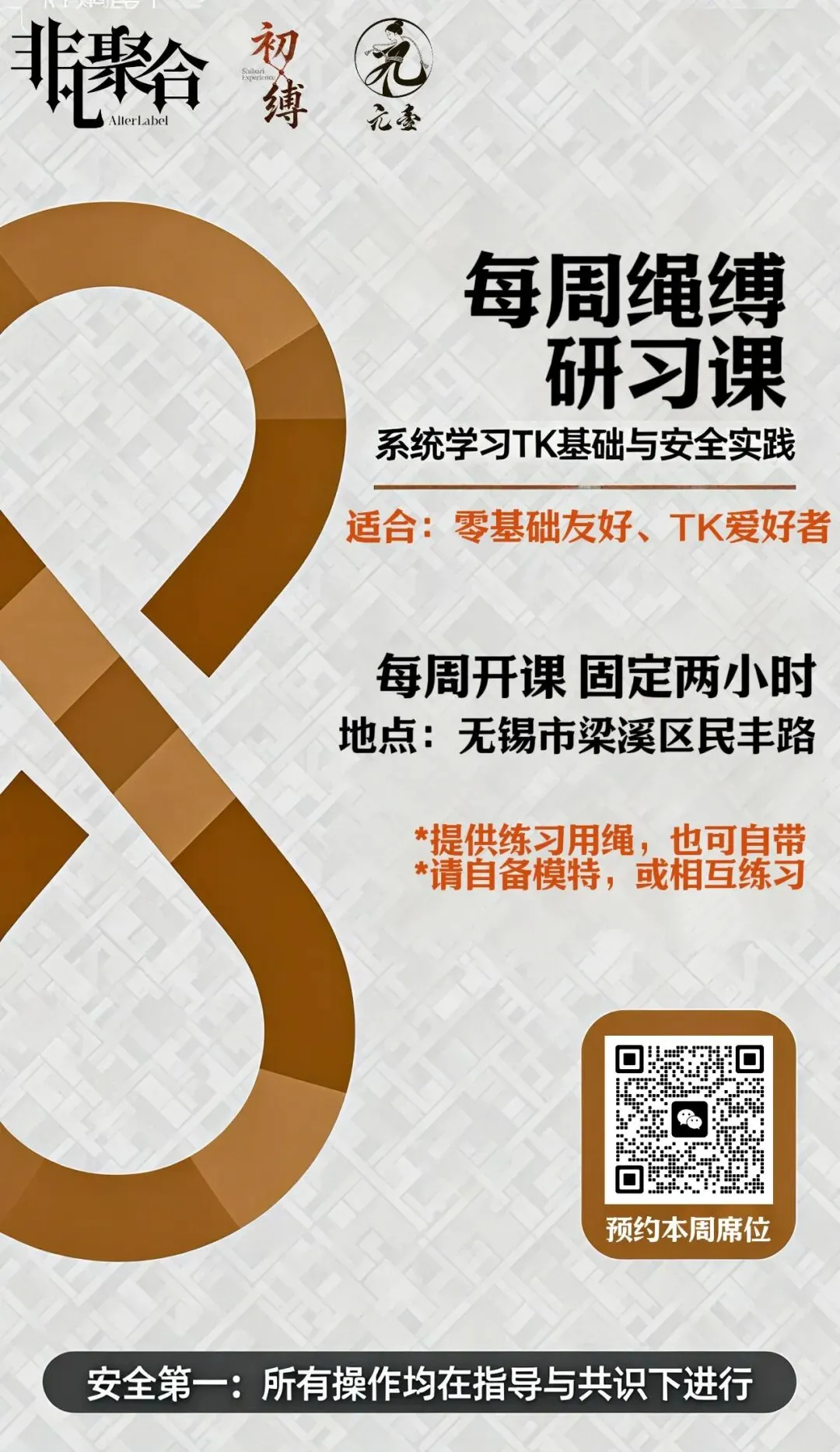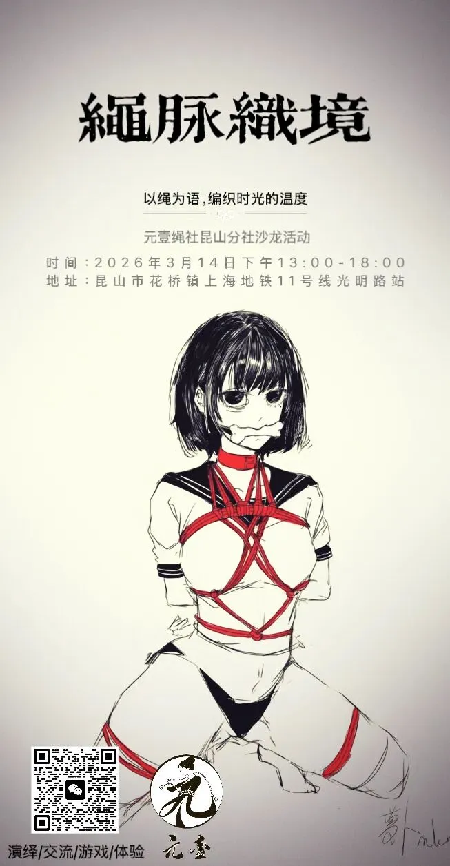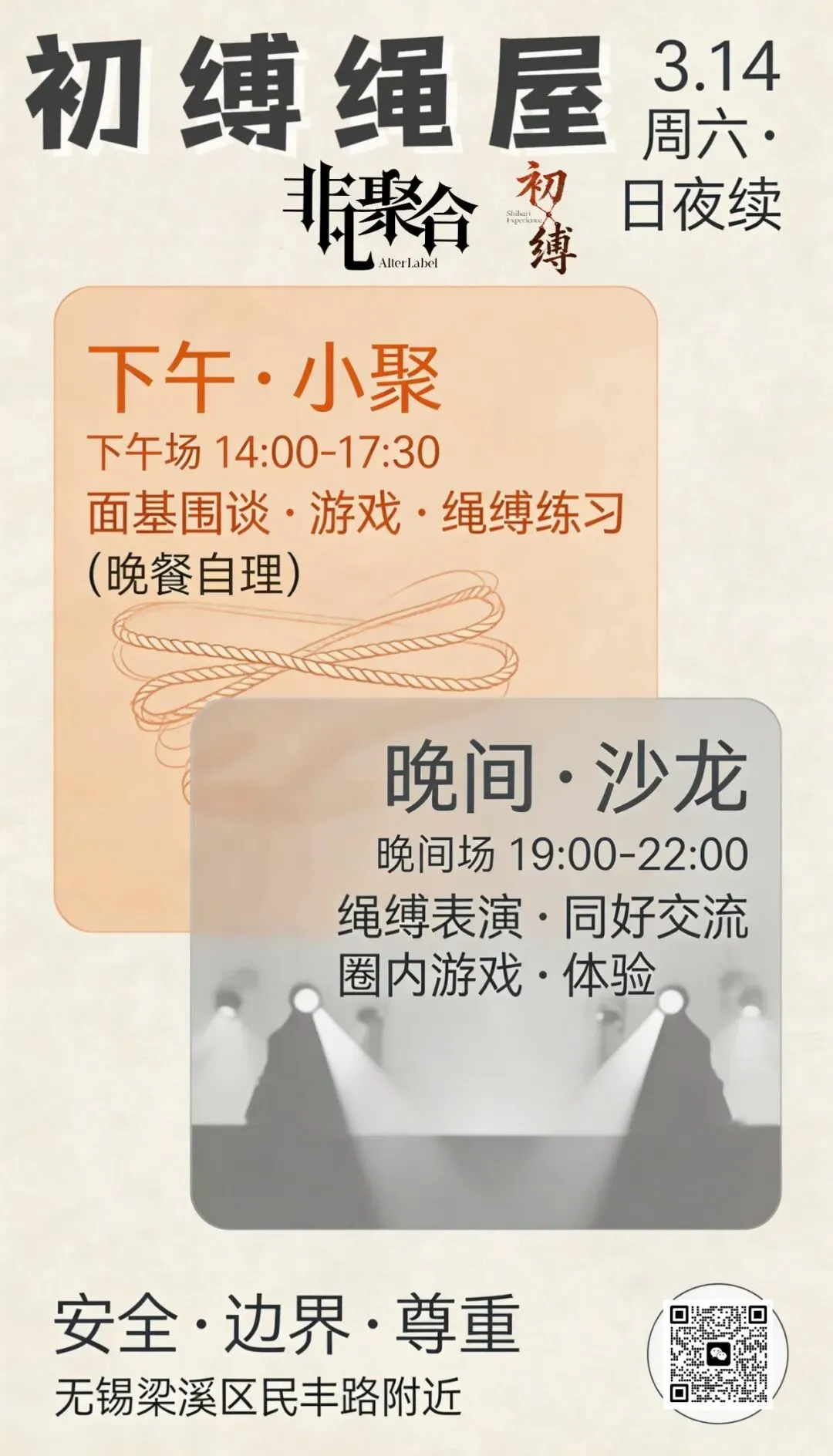 本周六,无锡初缚绳屋首次开放下午+晚上两场活动! 下午场 14:00-17:30 绳屋小聚 · 面基围谈 · 绳缚练习 · 小游戏 (晚饭自理,吃饱了晚上继续) 晚间场 19:00-22:00 绳缚表演 · 同好交流 · 圈内游戏 · 自由体验 放心来玩:安全第一 · 边界清晰 · 互相尊重 📍 无锡梁溪区民丰路附近 🔍 扫码报名,看看你能拼出怎样的周六