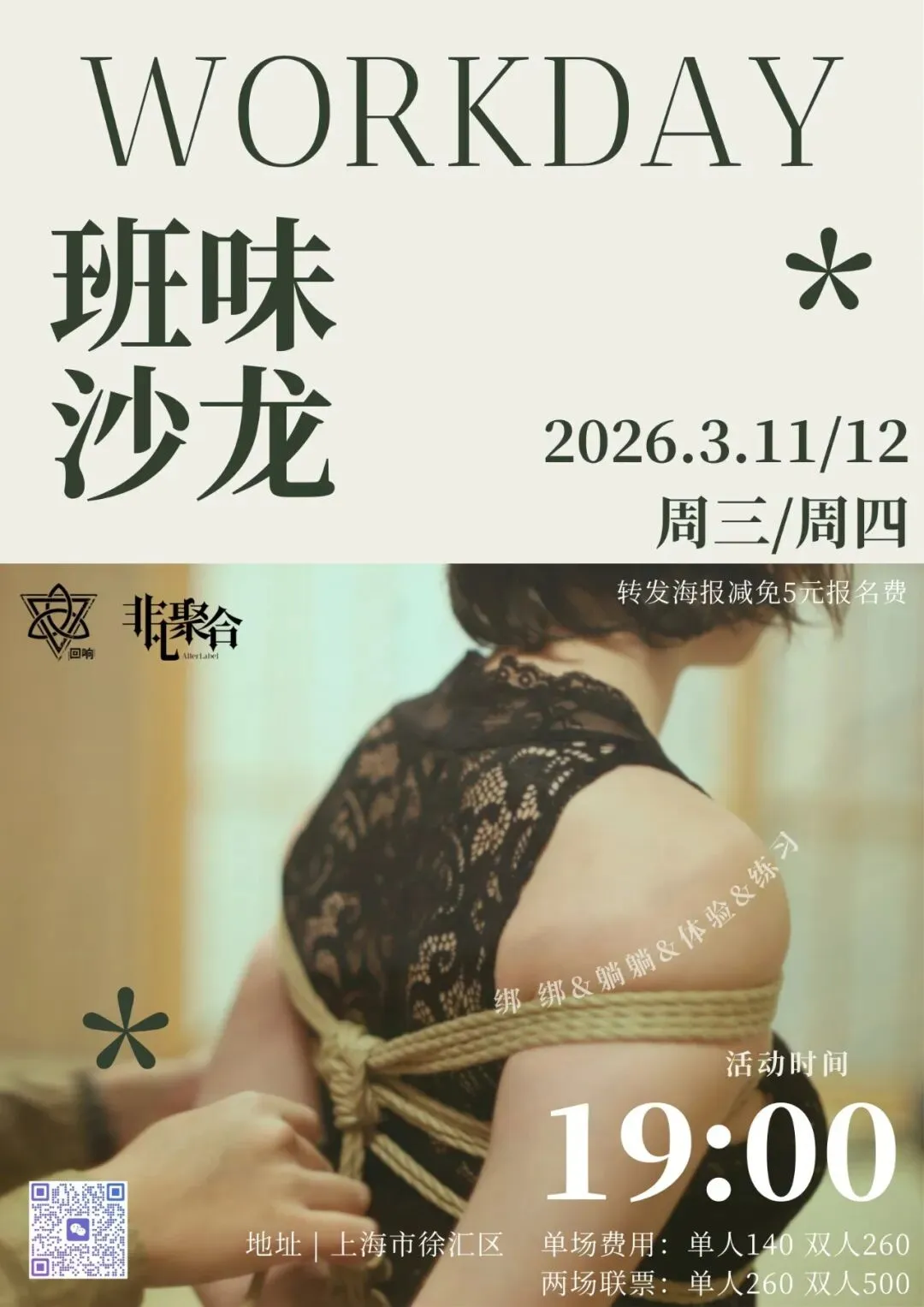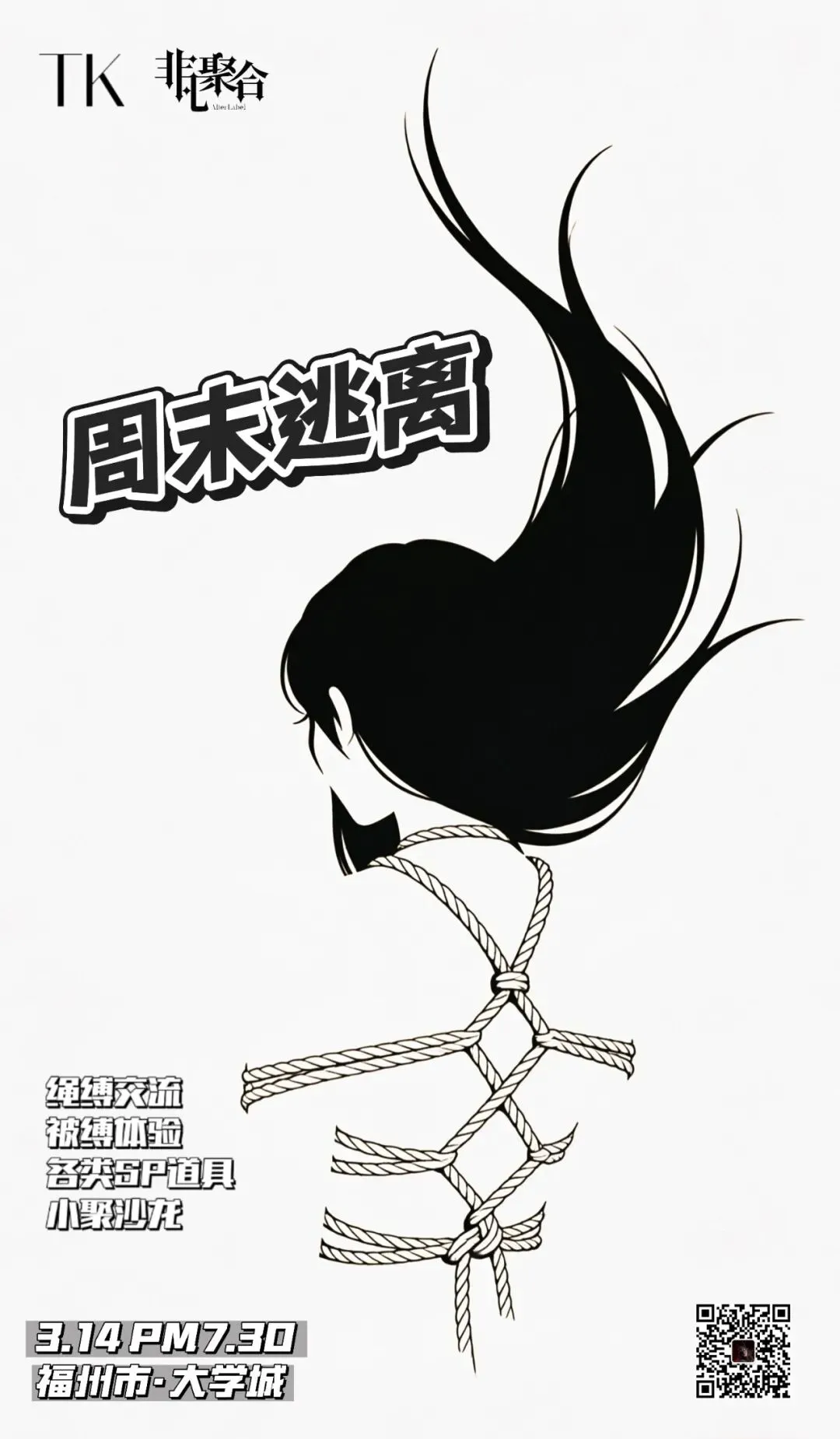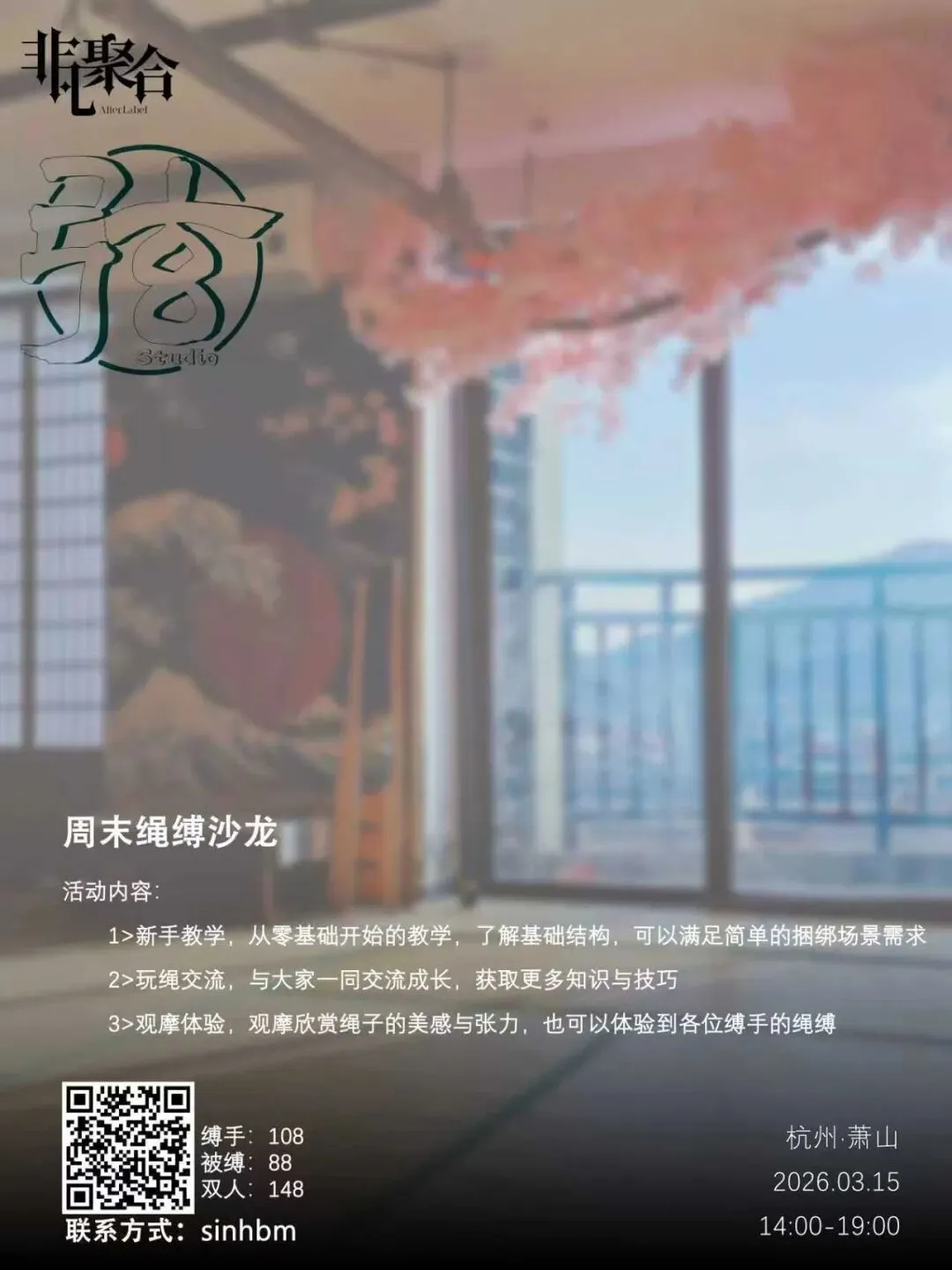 本周六,无锡初缚绳屋首次开放下午+晚上两场活动! 下午场 14:00-17:30 绳屋小聚 · 面基围谈 · 绳缚练习 · 小游戏 (晚饭自理,吃饱了晚上继续) 晚间场 19:00-22:00 绳缚表演 · 同好交流 · 圈内游戏 · 自由体验 放心来玩:安全第一 · 边界清晰 · 互相尊重 📍 无锡梁溪区民丰路附近 🔍 扫码报名,看看你能拼出怎样的周六
