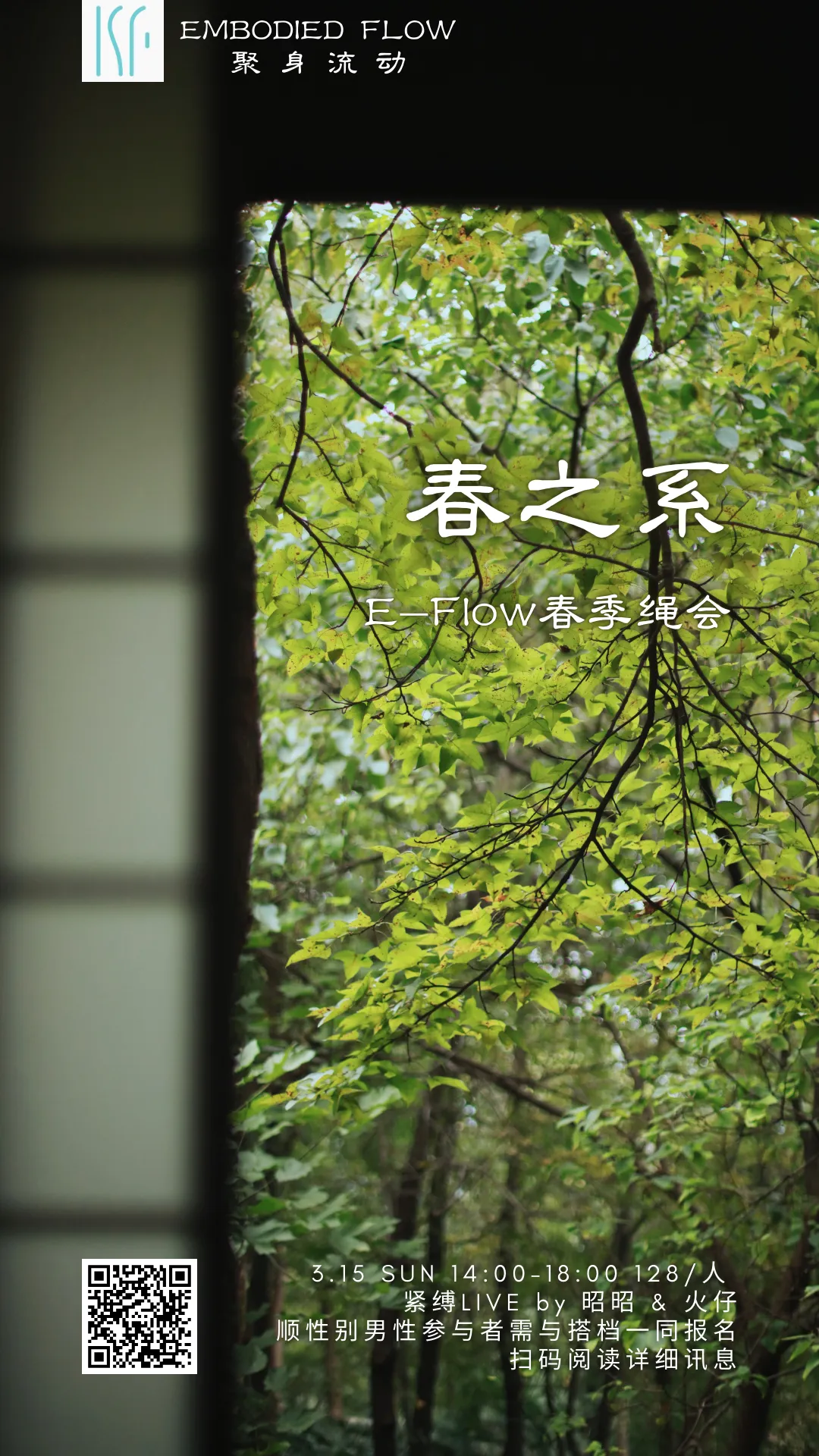 这个星期天,欢迎来到“春之系”,在一个温馨的下午和E-Flow的伙伴们一起自由绑绑,一起见证昭昭与火仔两位朋友的紧缚现场首秀。E-FLow是一个安静、内向者友好的酷儿空间,期待着和大家在绳会上相遇~