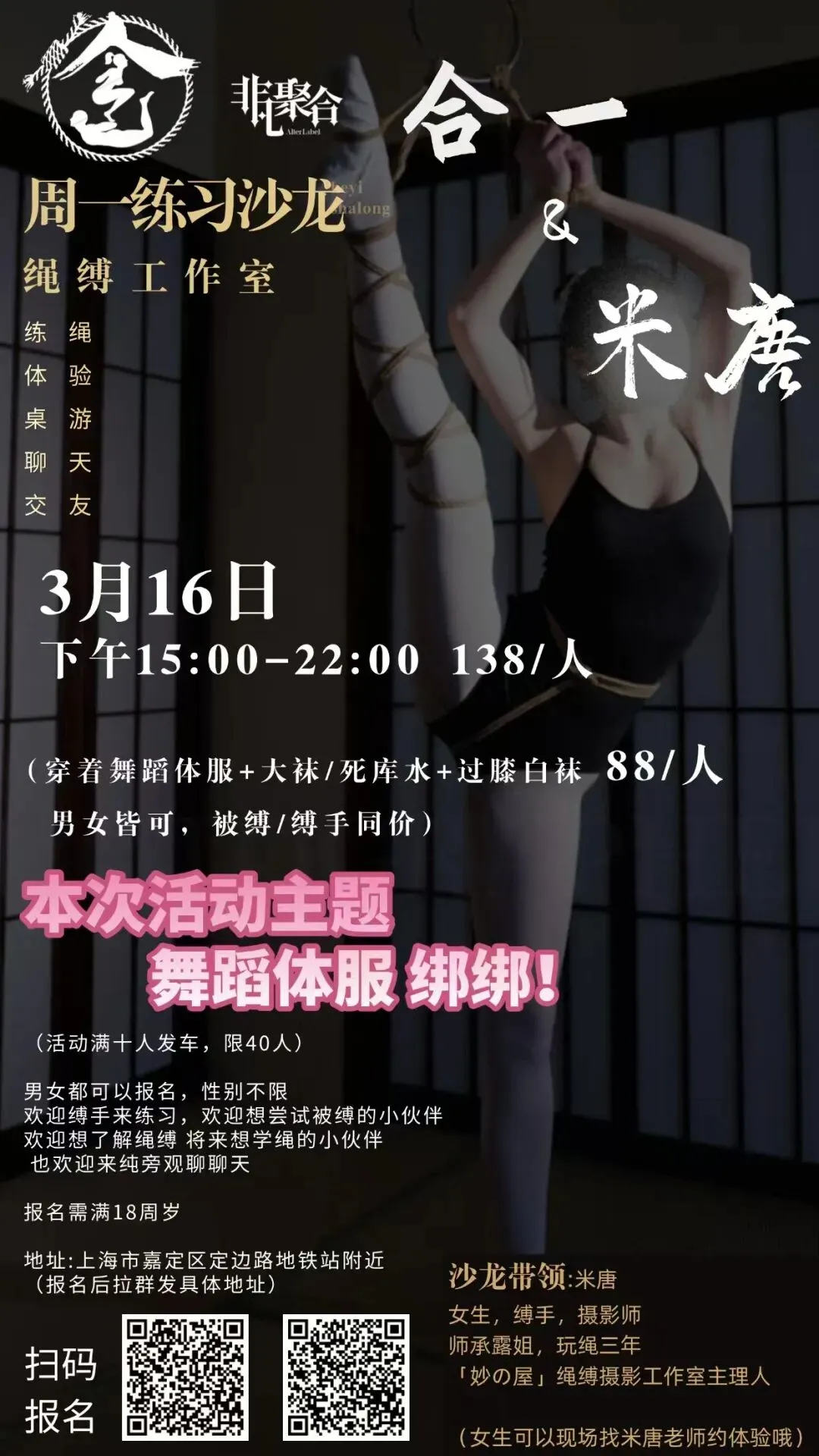 3.15(本周日)14:00-20:00,为周常研习会活动,时间超长,快乐加倍。男缚手女缚手都有,欢迎小伙伴们来躺躺贴贴捆捆玩玩!