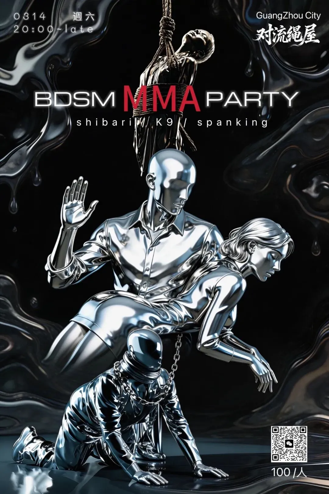 MMA 派對不是要你來格鬥,而是我們想要一次綜合性的bdsm主題活動。在不違反法律法規的前提下,大家可以嘗試各種方式,比如spanking與繩縛的融合,k9與繩縛的融合,盡情發揮你的想像,開始你的玩耍。