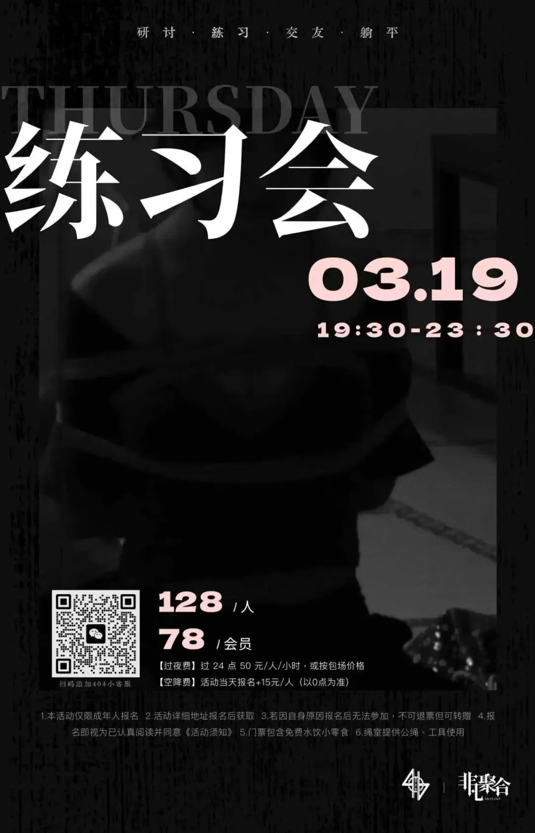 本周【青茗工作室】周四晚上依旧是绳缚练习日~这周周六下午是日式后手缚的教学,晚上会用抽签的形式决定参与的朋友以什么形态进入“撕名牌”的游戏,欢迎大家的参与~
