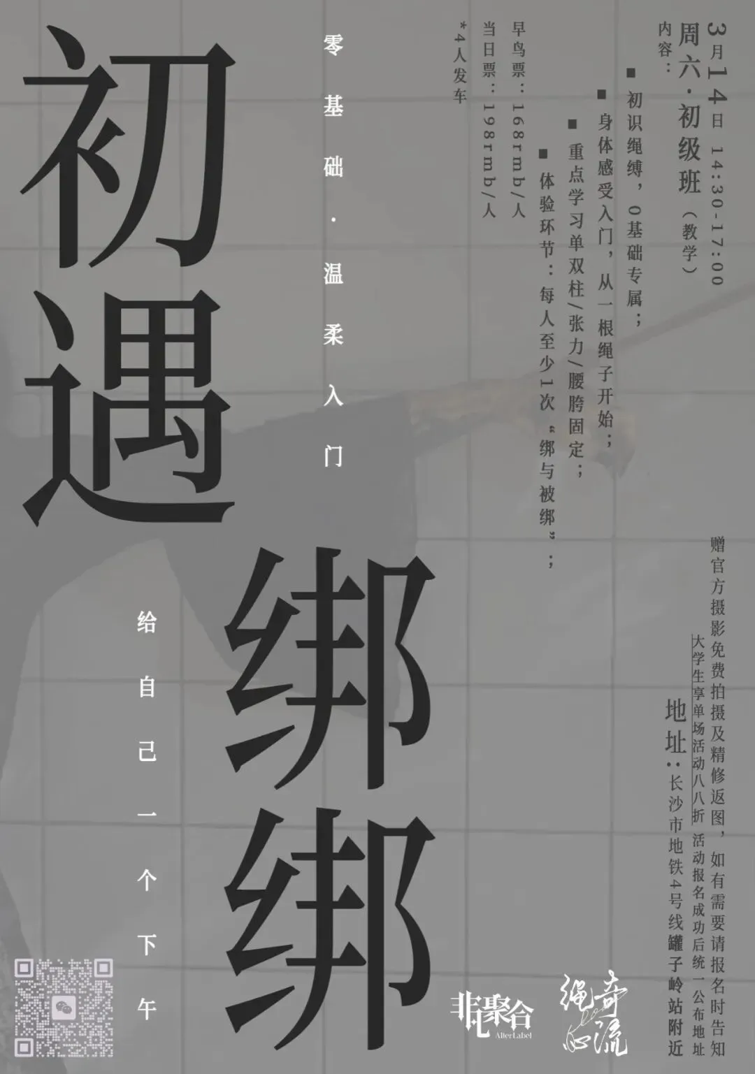 人当然需要喜欢什么, 喜欢上一些可以让你忘记疲惫与烦恼, 甚至会放松到让你忘记自己的存在的事物。 初遇绑绑, 如同一切万事万物的初次相逢, 带着好奇与心中的期待, 推开这扇门就如同进入了一个全新的领域。 或许你才刚刚开始接触绳缚, 或许你已经观望许久却迟迟未能实践, 或许你想要深入正式地认真学习绳缚, 3月14日下午14:30-17:00,绳缚初级班,适合新手小白的绳缚课,【绳奇心流flow】期待与你一同感受绑绑。从单双柱开始,学习腰跨的固定,感受张力如何绕过皮肤,绕进呼吸,在缠绕里,把自己接住。