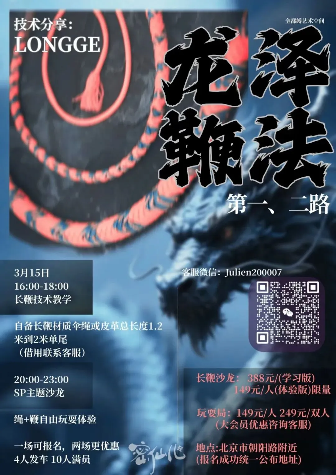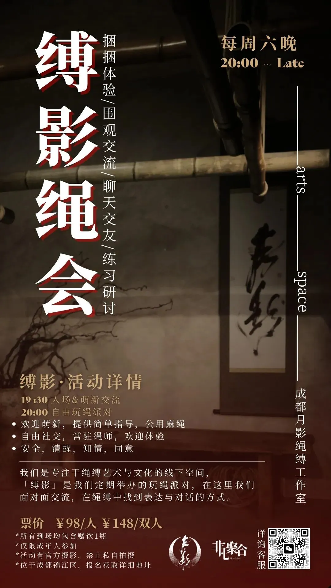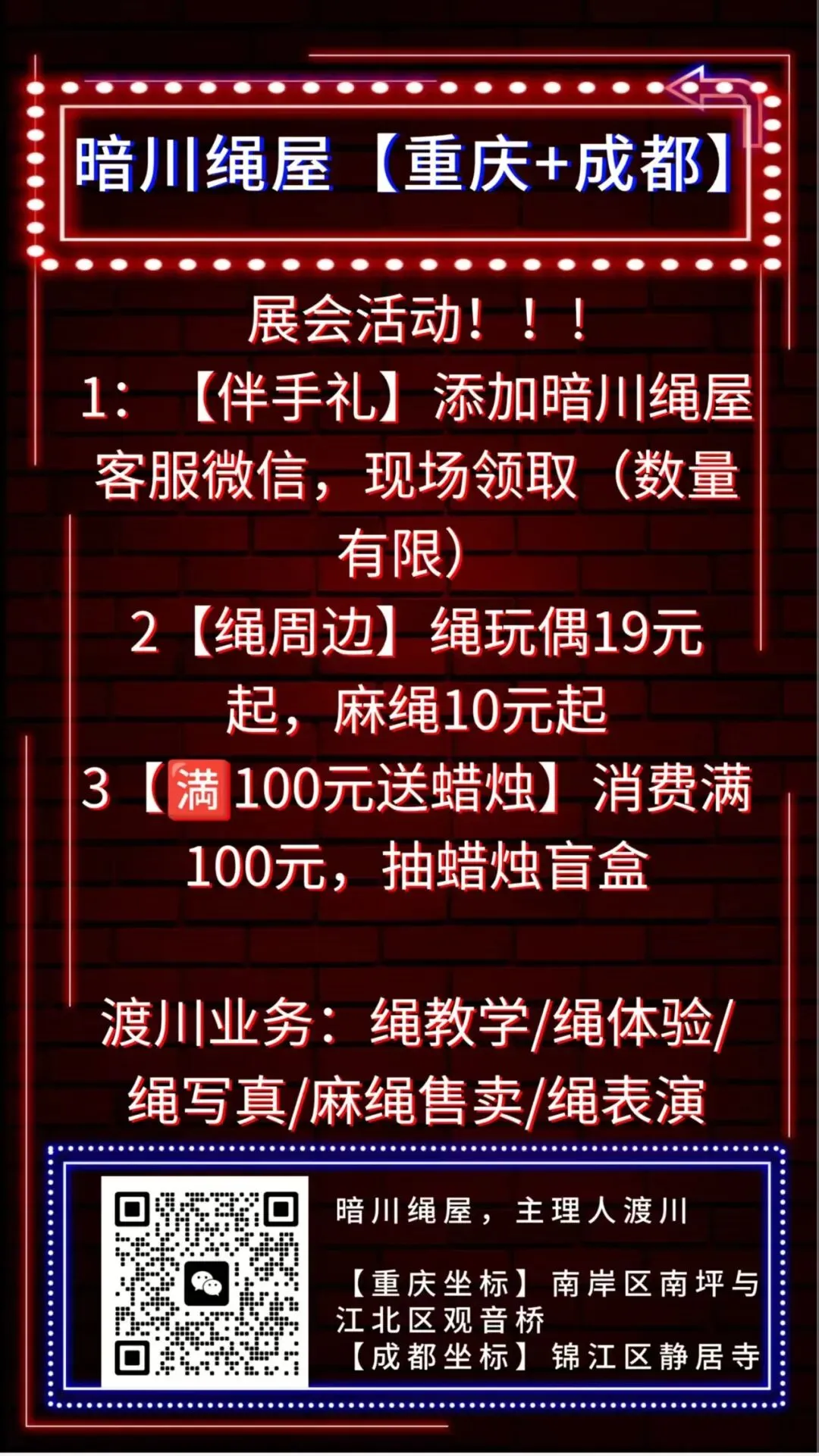 活动内容: 1>新手教学,从零基础开始的教学,了解基础结构,可以满足简单的捆绑场景需求 2>玩绳交流,与大家一同交流成长,获取更多知识与技巧 3>观摩体验,观摩欣赏绳子的美感与张力,也可以体验到各位缚手的绳缚