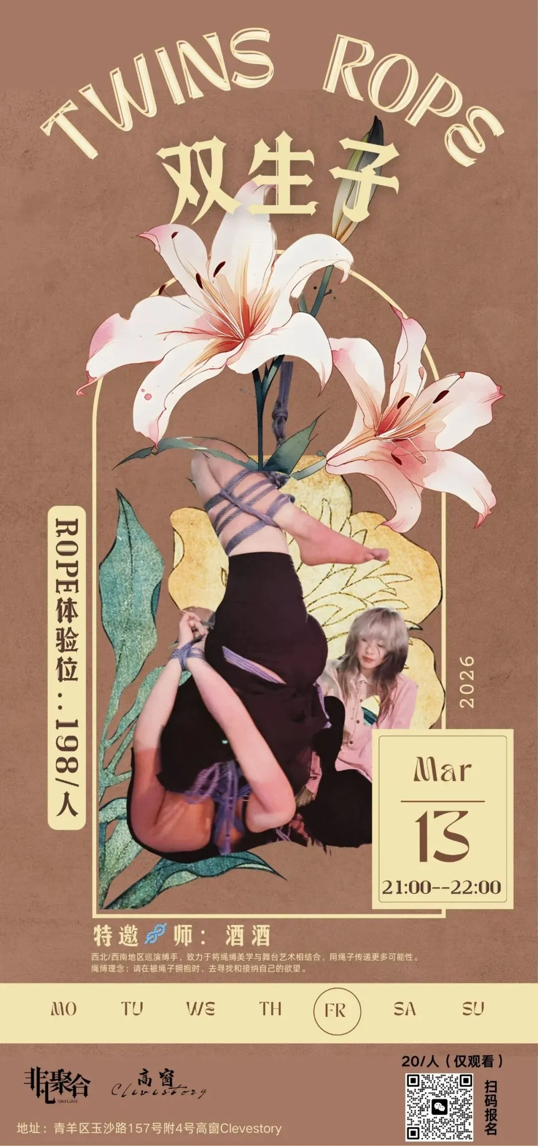 🌟双生子ROPE🌟 ❤️特邀SHIBARI:酒酒❤️ 西北/西南地区巡演缚手,致力于将绳缚美学与舞台艺术相结合,用绳子传递更多可能性。 绳缚理念:请在被绳子拥抱时,去寻找和接纳自己的欲望。 🌙🌒🌓🌔🌕🌕🌔🌓🌒🌙 活动时间:3月13 21:00-22:00 门票:20/人(观看位) 198/人(绳缚体验)