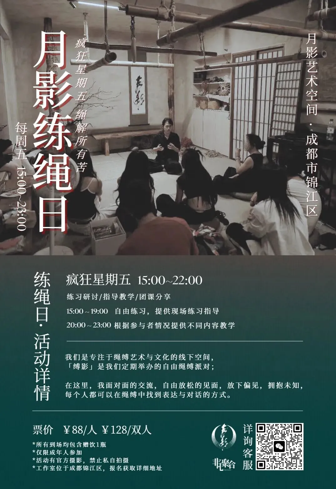 每周二周四,责韧空间将举办练绳会,可练绳、交友、喝酒、电玩…,周四增加放映场,经huahua老师授权,放映其影像资料,包含绑法教学与体验。更有教学助教与陪练可辅助练习,感兴趣的小伙伴快来报名啦~