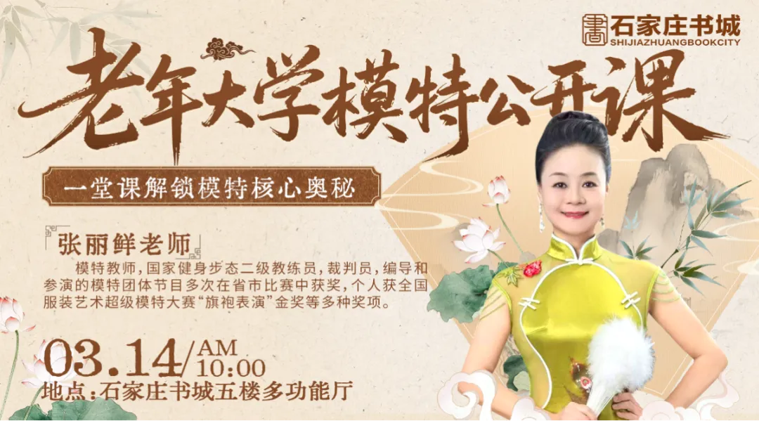 3月14日上午10时,老年大学模特公开课将在石家庄书城五楼多功能厅准时开讲。本次课程特邀资深模特教师张丽鲜老师亲临指导。