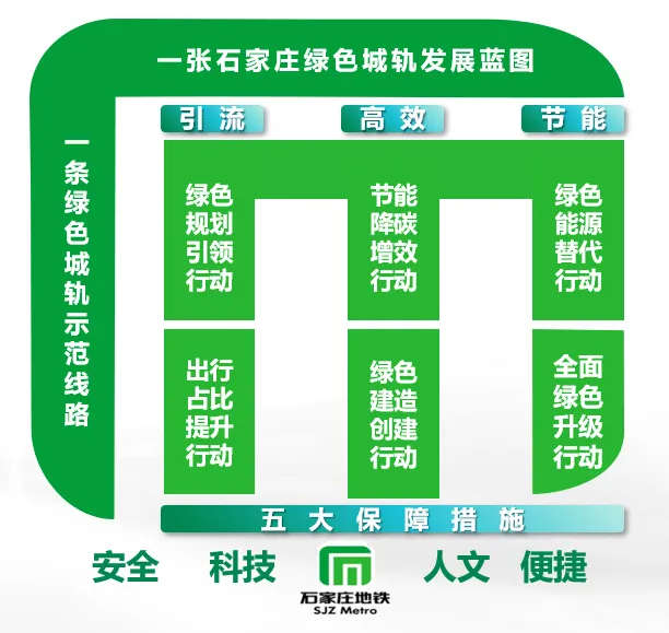 《石家庄市轨道交通绿色城轨发展行动方案》充分采纳行业先进经验,积极引进绿色低碳技术,以“引流、高效、节能”为行动方向,铺画了具有石家庄特色的“1-3-6-5-1”绿色城轨发展蓝图,开展“绿色规划引领、节能降碳增效、出行占比提升、绿色能源替代、绿色建造创建、全面绿色升级”六大绿色城轨行动,统筹规划集团绿色发展路径和行动方案,为全面提升集团绿色发展能力、建成绿色城轨提供了指导。