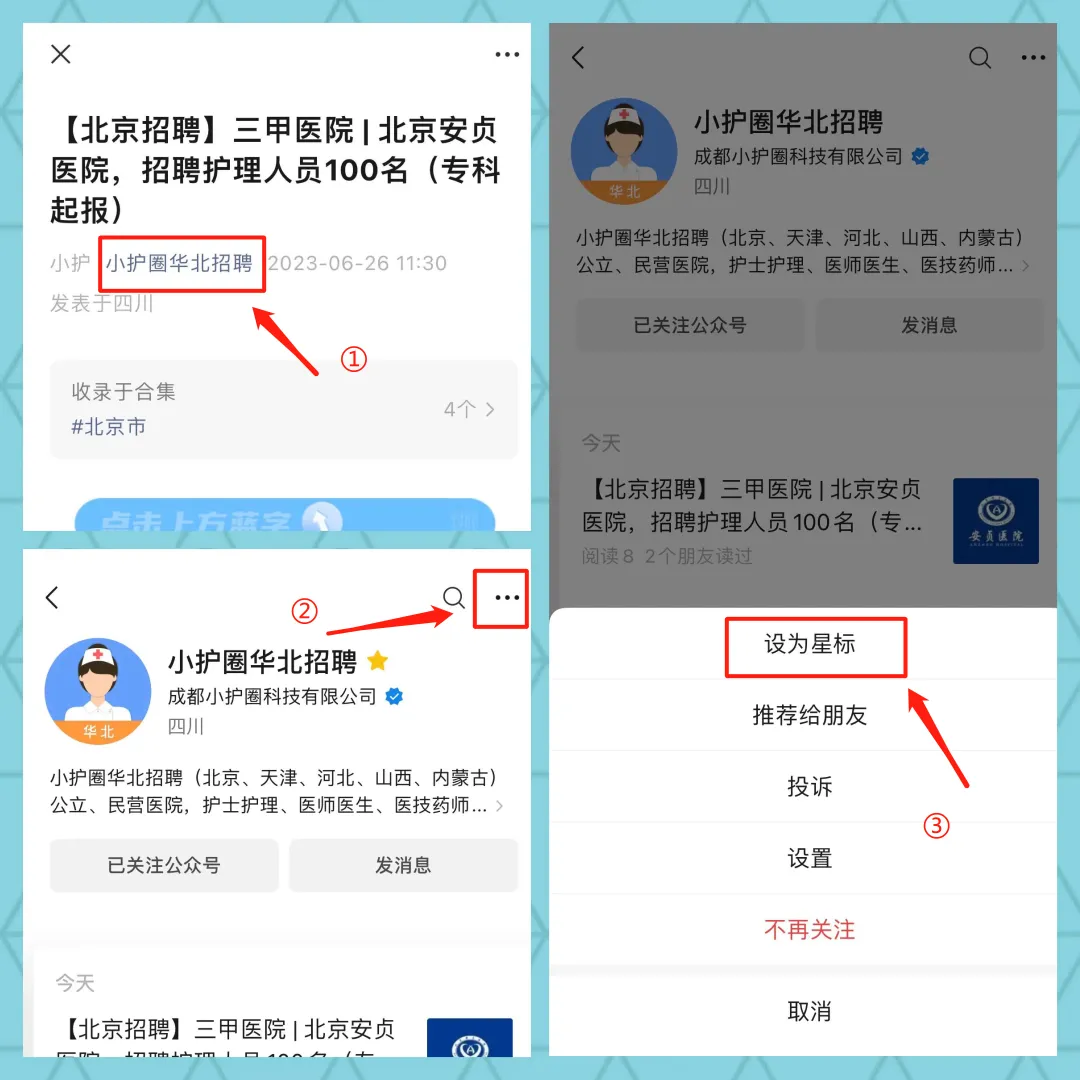 您一定收藏与转给更多人!不要错过报名时间!更多精准地区招聘信息,关注小护帮手,订阅城市。实时在线更新!由于微信公众号改版,很多读者朋友反映,最近在订阅号列表里找不到我们了。为了防止和我们走散请给公众号“小护圈华北招聘”设个星标吧!