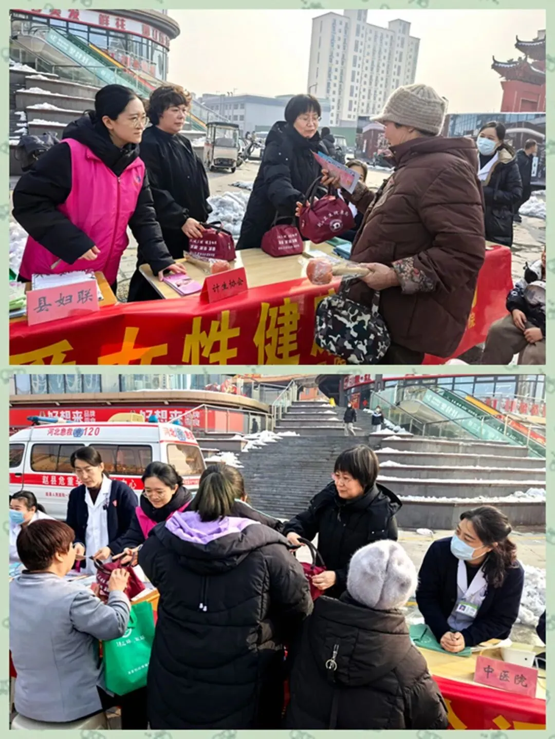 赵县计生协联合县妇联带领县人民医院、县中医院、县妇幼保健院医护人员,在赵州印象城广场开展以“关爱女性健康、维护妇女合法权益、弘扬新型婚育文化”为主题的宣传服务活动,把健康服务与暖心关怀送到妇女群众身边。活动现场设置健康咨询点和问诊区,工作人员为过往群众发放优生优育、适龄婚育、托育服务等宣传折页并解读相关政策;医护人员免费为现场妇女群众提供专业诊疗和健康咨询服务,并耐心细致地提供个性化的健康指导建议。他们以专业的医术、细致的关怀、温暖的态度,让前来问询的妇女群众在享受便捷优质医疗服务的同时,切实感受到社会大家庭的关心与温暖。