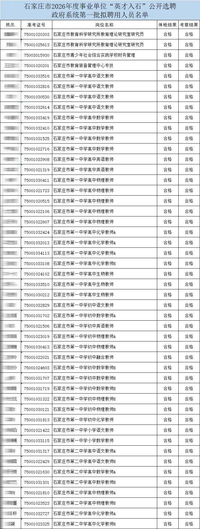 现对石家庄市2026年度事业单位“英才入石”公开选聘政府系统第一批拟聘用人员进行公示,公示期为3月13日至19日。公示期间如有异议,请拨打举报电话或发电子邮件。公示期满后,请拟聘人员及时与所报考的市直部门(单位)或县(市、区)人社局联系,办理入职、聘用等相关手续。