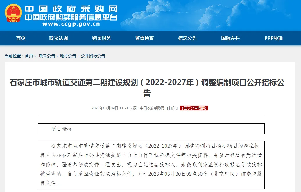3月9日,中国政府采购网发布《石家庄市城市轨道交通第二期建设规划(2022-2027年)调整编制项目公开招标公告》,对石家庄地铁二期规划调整项目进行招标。