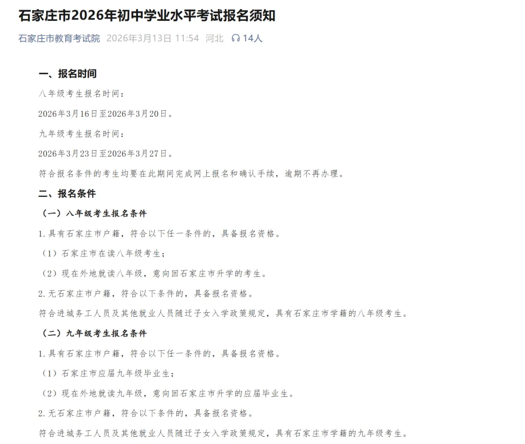 2026 年石家庄市初中学业水平考试报名工作即将开始,为方便家长和考生快速了解报名时间、条件、网址、流程,现将关键信息整理如下: