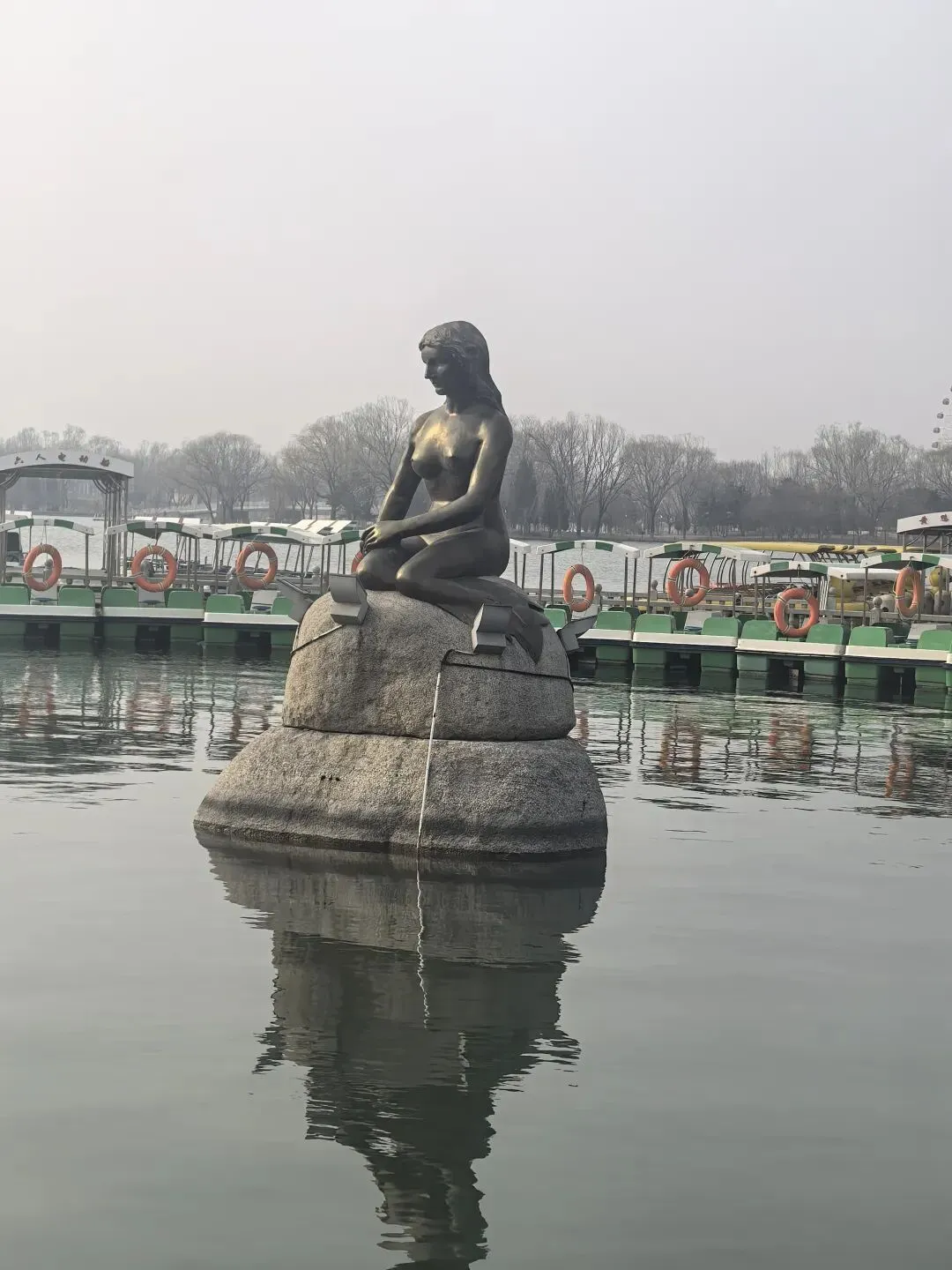 美人鱼雕像静坐在水中央,与湖面倒影相映成趣,是春日里最静谧的风景