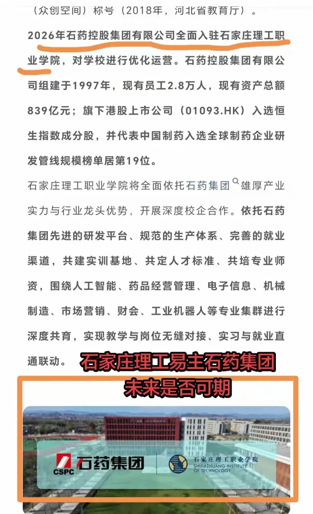 2026年河北民办高职领域的重大变动:石药控股集团全面入驻并优化运营石家庄理工职业学院,当地医药龙头企业接盘民办高校的校企深度融合案例,利好与挑战并存,但至少对学生老师来说,是全面利好,学生、家长、老师悬着的心终于可以放下了。