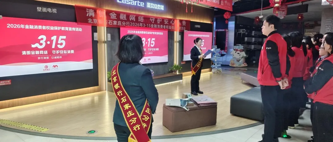 在2026年“3·15”国际消费者权益日来临之际,为提升金融消费者的风险防范意识和能力,营造和谐健康的金融消费环境,3月6日,北京银行石家庄分行走进京东电器建华店,开展金融知识宣传教育活动。