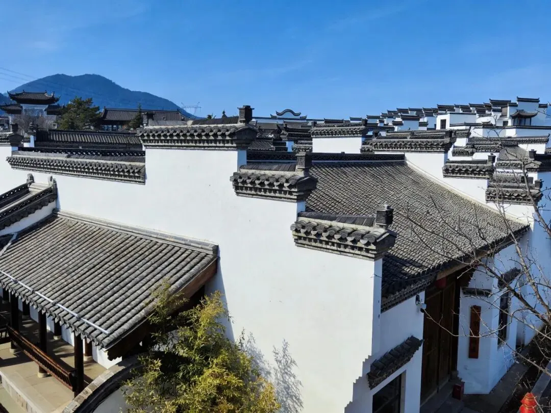 园区的左手边有一座气势恢宏的入口门罩,是整个园区的标志性建筑物,也是徽派"门罩"艺术的典型代表。这是一座四柱三间三楼式的木构门罩,采用了徽派建筑中等级较高的 “将军门” 形制,显得庄重气派。四根立柱支撑起层层叠叠的斗拱和飞檐,屋檐下的木雕极为精美,展现了徽派 “三雕” 中木雕的高超技艺。主体为优质老杉木,经过防腐、防虫处理,部分构件采用了鎏金工艺,在阳光下熠熠生辉。屋顶采用了歇山顶,飞檐翘角,屋脊上装饰有吻兽,两侧还有小型的附檐,整体造型舒展而富有动感,是典型的徽派建筑屋顶风格。