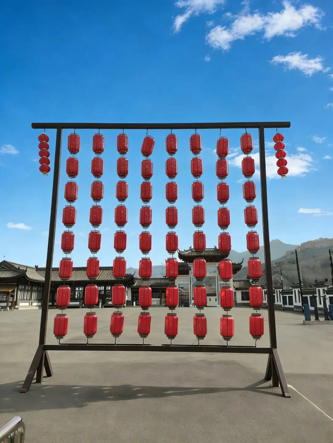园区门口有一座红灯笼,木制的架子,上面悬挂着8排8列红灯笼,既是徽派古建的传统装饰,也是开门纳福、心宽福至的文化呼应,同时8×8=64,民间取 “八方来财、四平八稳、发发发”;双 8 更强调 “好事成双、福满加倍”;圆形灯笼本身象征团圆圆满,红色驱邪纳福,“灯” 通 “丁”,寓意人丁兴旺。另外白墙黛瓦的冷色调,需要红灯笼的暖红提亮;其尺寸恰好和入口门坊的比例协调,不会遮挡砖雕额枋的文字;成对、成组悬挂,符合徽派建筑 “对称、中正” 的原则。