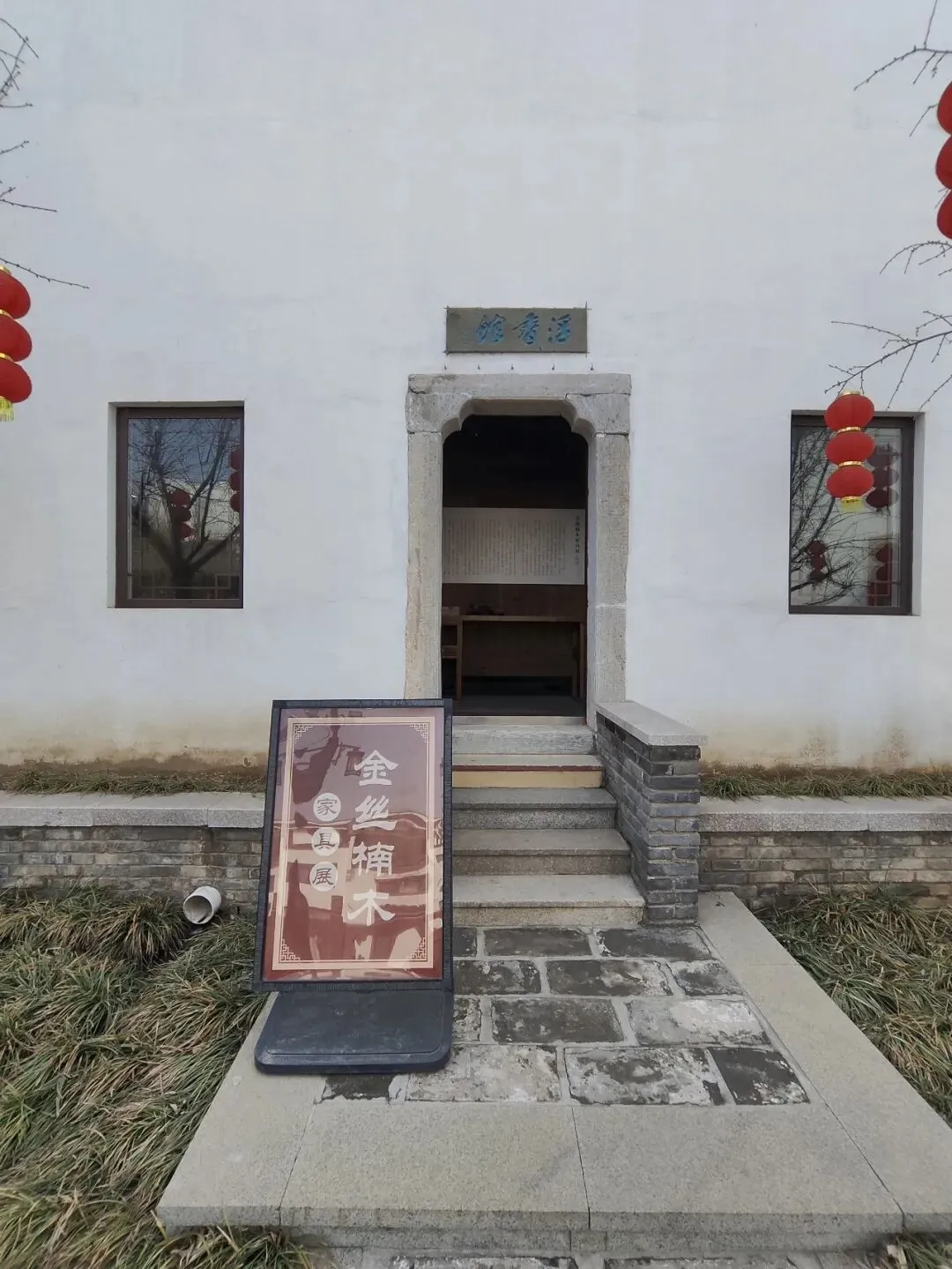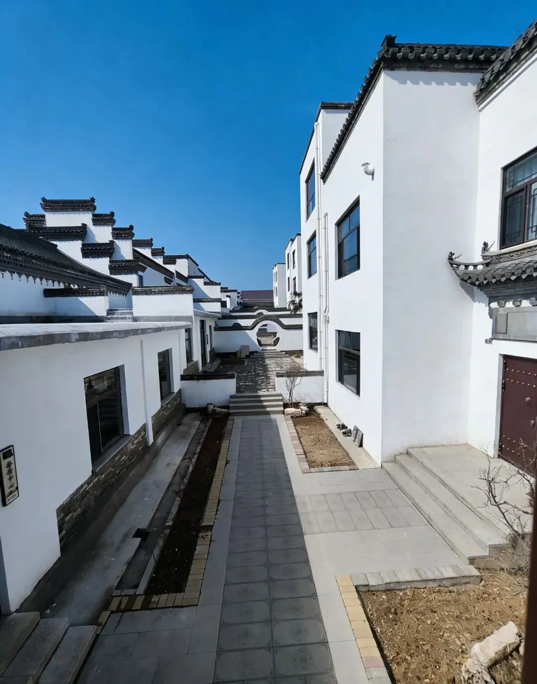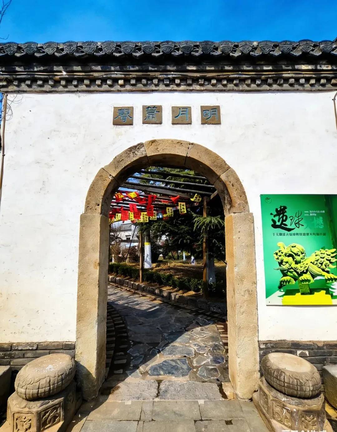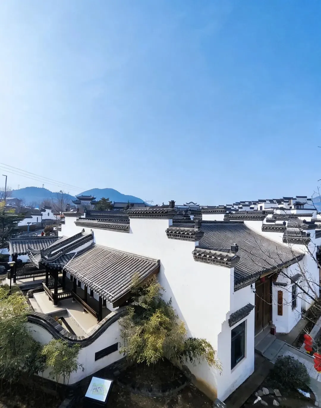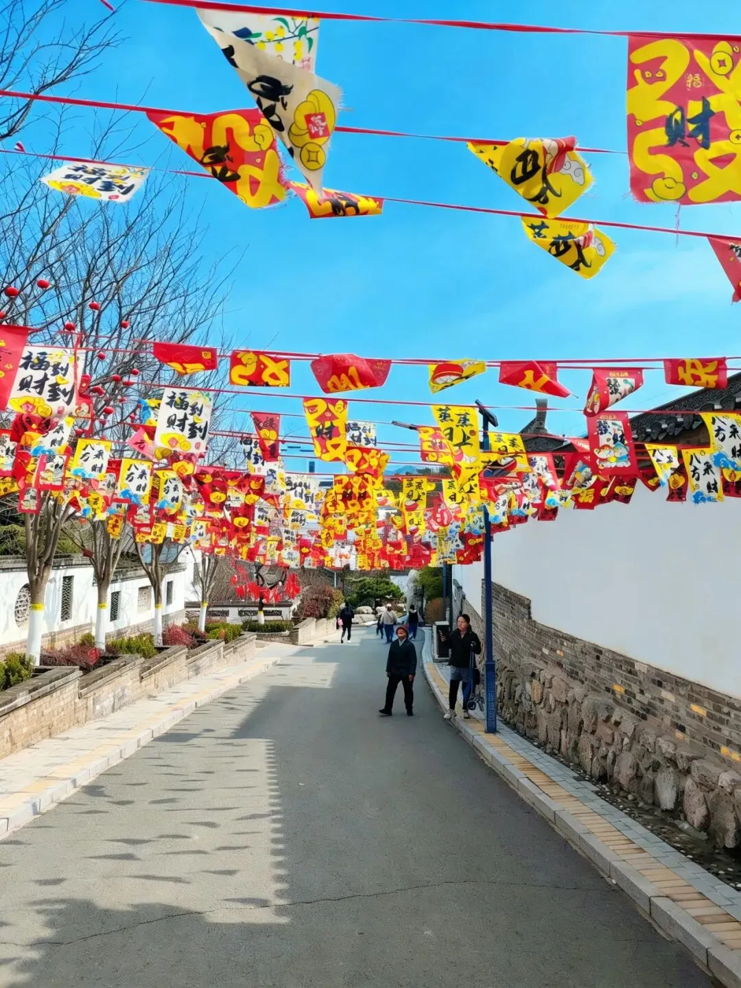 一路向下,路的两侧是黛瓦白墙,仿佛置身于徽州古城一般;还有很多植物、灌木和树木,绿色的竹子苍翠依然,其他的植物还未苏醒,仿佛在等待主人的召唤,等树绿了花开了,想必风景会更加别致。树上挂着红红的灯笼,头顶上挂着红黄相间的各种祝福语,仿佛提醒我们新春依旧在。