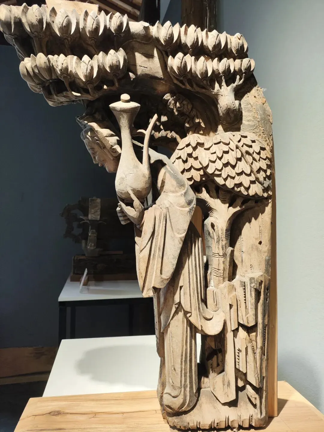 走到半路,看到了一处别院"明月萧声"-很富有诗意的名字,别院的设计运用了巧思和匠心,青石板铺就的小路,入目可见的是树木植被;沿着小路继续向前行进看到的是水榭及怪石嶙峋,水榭的前面是小池,碧绿的池水倒映着蓝天白云,水榭的对面是碧华厅,是我所参观的第一座博物馆--遗珠无憾 子元徽派古建筑遗留木构雕件展,其中展出了很多清代的木雕,如透雕角花,牛腿,狮子雕件,和合二仙,雀替等等,多用樟木、楠木(防虫防蛀),技法有浅浮雕、深浮雕、透雕、圆雕,构图饱满,层次分明,雕刻立体,活灵活现,栩栩如生。