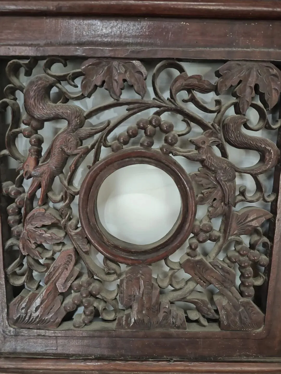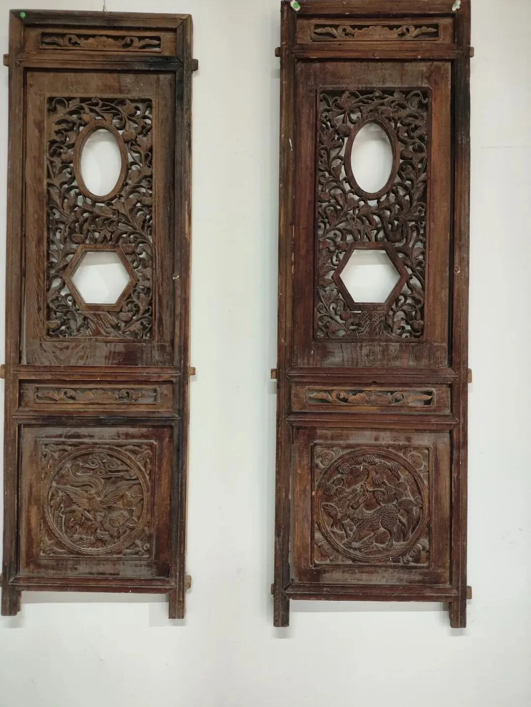 门罩正中央的大额枋(横梁),这是最核心、最显眼的位置,通常是整组木雕的主题。常见题材:“福禄寿喜”:蝙蝠(福)、鹿(禄)、仙鹤 / 寿桃(寿)、喜鹊(喜)组合出现;“吉祥瑞兽”:龙、凤、狮子、麒麟,象征威严、辟邪、子孙贤良;“卷草纹 / 回纹”:连绵不断的线条,寓意生生不息、富贵绵长。
