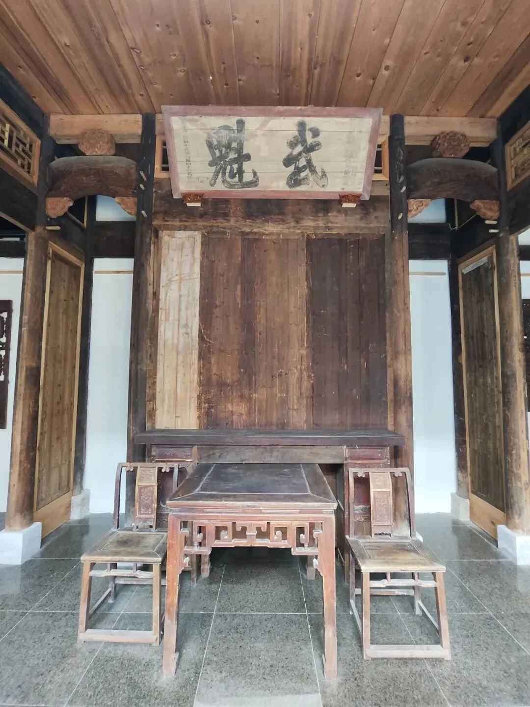 《武魁》匾额,“武魁” 是武举乡试中举者的荣誉称谓,对应文科的 “文魁”,代表武科考试的优异成绩。武魁获得者为武举人,可进一步参加会试考取武进士,是清代尚武之风与科举制度的直接见证。一般悬挂于厅堂正上方,下方陈设清代方桌与靠背椅,是典型的客家或江南古民居厅堂格局,彰显家族荣耀。