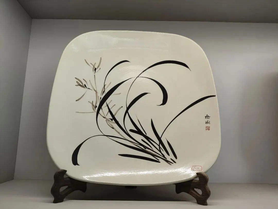 安老非常擅长创作兰花题材的磁州窑作品,兰花是他极具代表性的创作主题之一,他本人爱兰、养兰、画兰,工作室养有上百盆兰花,以兰喻人、以兰抒怀。兰花在磁州窑传统中属 “四君子” 题材,寓意高洁、清雅,契合他的艺术追求。主要用白地黑花(铁锈花) 传统技法画兰。特点:叶姿洒脱、花瓣圆润、墨色浓淡相宜,既有传统磁州窑的豪放,又有文人画的清雅。常见载体:瓷盘、瓷瓶、瓷枕、茶器、茶饼盒等。