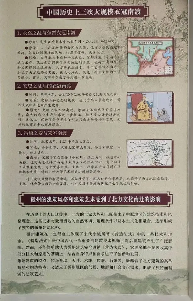 另外,中国历史上三次大规模衣冠南渡:永嘉之乱与东晋衣冠南渡,安史之乱后的衣冠南渡,靖康之变与宋室南渡,这三次大规模的衣冠南渡,不仅改变了中国人口的分布格局,也推动了南方地区在经济、文化、社会等方面的全面发展。徽州的建筑风格和建筑艺术受到了北方文化南迁的影响,如马头墙、天井、木雕、砖雕、石雕等,既蕴含了北方建筑的某些布局和构造特点,又适应了徽州地区的气候、地形和社会文化需求,形成了独特而精湛的建筑艺术。
