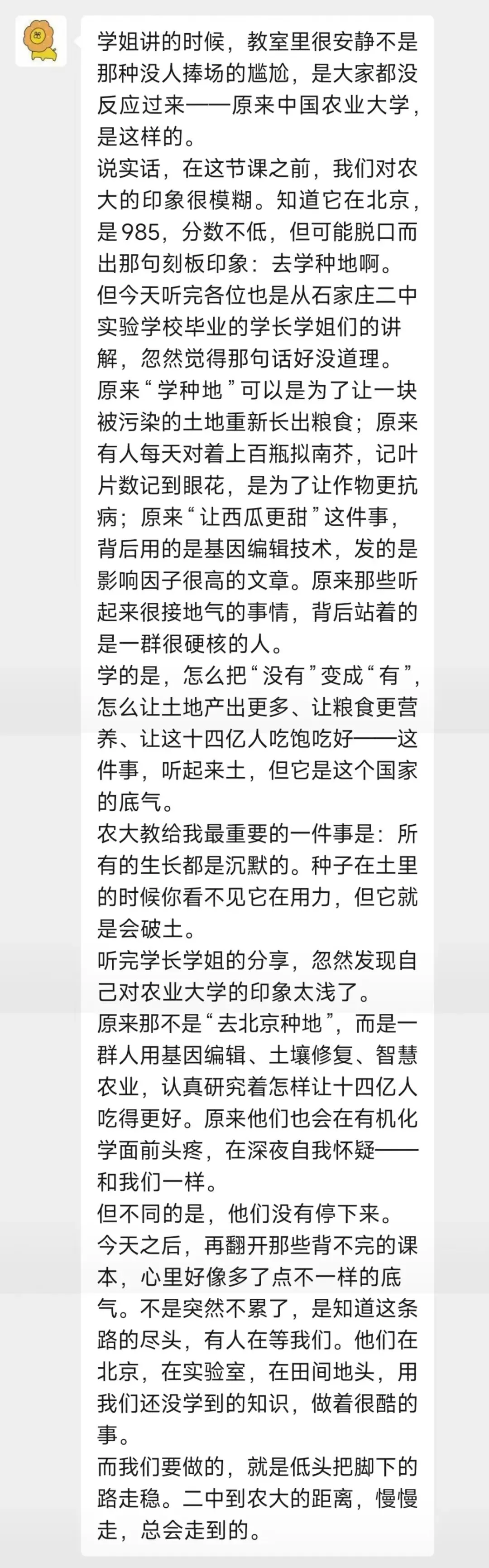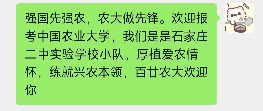 此次返校宣讲不是终点,而是新的起点。未来,我们将继续传承二中实验“坚毅 勤奋 诚朴 健美”的校训,铭记中农“解民生之多艰,育天下之英才”的使命,努力成长为更优秀的自己。同时,也期待能有更多从石家庄二中实验学校走出的学子,奔赴中国农业大学,深耕农科、奋勇争先,用青春力量书写报国华章;更祝愿母校蒸蒸日上、再创辉煌,祝愿学弟学妹们不负时光、不负努力,在2026年的高考中旗开得胜,抵达自己心中的理想彼岸,我们在美丽的中国农大,静候大家的到来!