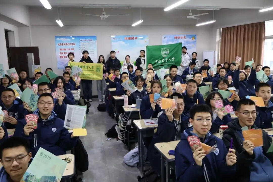 我们精心设计并印刷了中国农大宣传手拉旗、海报,整理了包含36个国家级一流本科专业建设点、A+学科优势等核心信息,自制了宣讲PPT,还特意准备了带有中农校徽的笔、书签等纪念品,既增强宣讲的记忆点,也寄托着对学弟学妹们的美好祝福。同时,我们反复打磨讲稿,摒弃照本宣科的模式,结合自身从二中实验到中农的成长经历,用学弟学妹听得懂、愿意听的话语,解读中农的实力与魅力,确保每一份分享都真实、实用、有感染力。