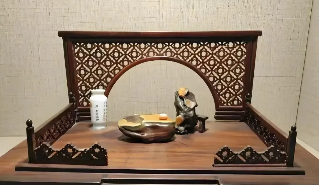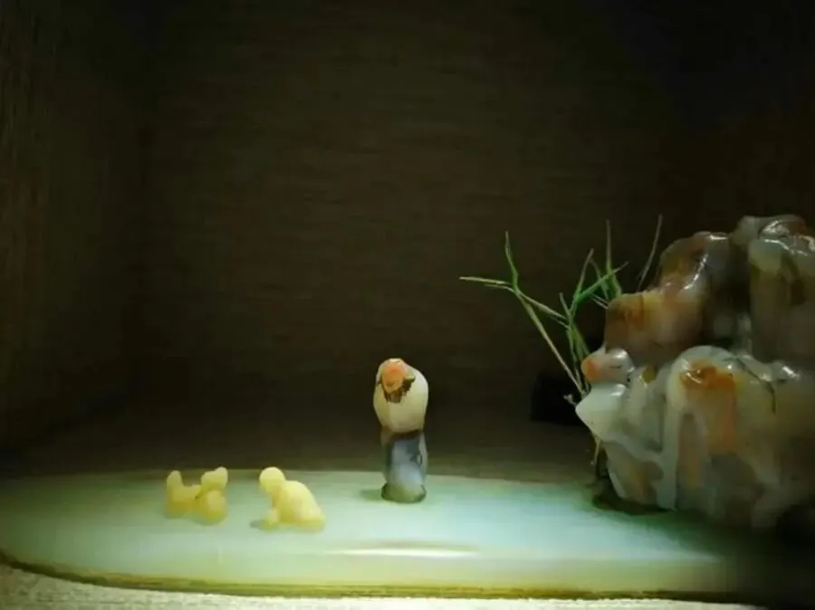 去年精品展中的一组《天伦之乐》作品(如图),更是精致赏石的典范。尽管作品展示的场景不大,但赏石理论的“形、质、色、纹、韵”五要素,被展现的淋漓尽致。主题人物的老者,虽身高不过几寸,身着色彩鲜明的长袍马褂,双手抄袖,神态自然、虽霜染两鬓,但面容红润,五官精致到位,开心观看孙辈嬉戏,乐得合不拢嘴。把老者的天伦之乐之情、对孙辈的疼爱展示的唯妙唯肖。再观配制的假山,其色彩斑斓。其形态及纹理变化非常丰富,大小高矮恰到好处,增一分则显高,减一分则显矮,就连配件绿植也极精致到位。