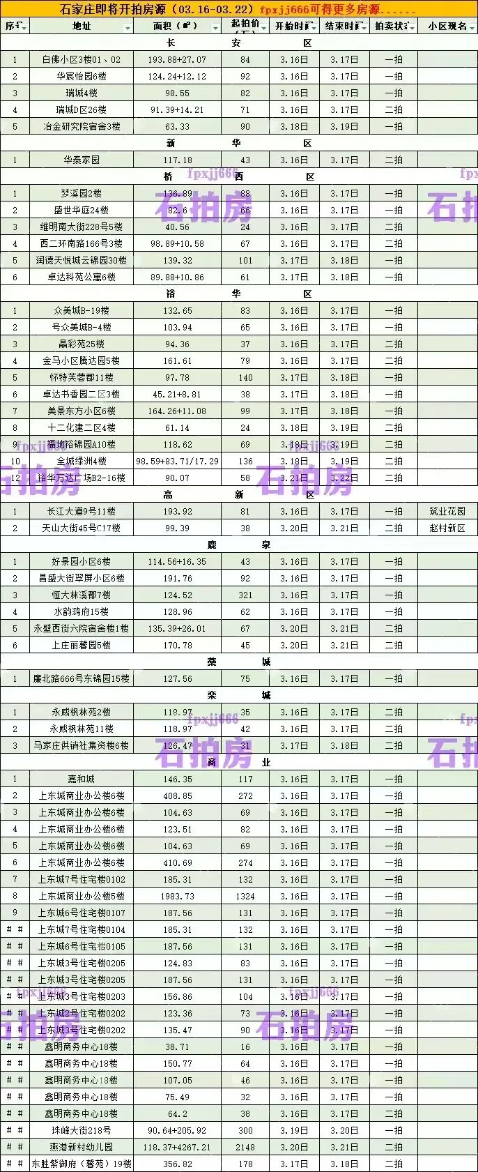 下周即将开拍房源,大家及时关注开拍日期,别错过,有任何问题,请微fpxjj666咨询!!!重点推荐房源有:瑞城、润德天悦城、众美城、怀特芙蓉郡、万达广场等此表内房源仅为展示,需签约后尽调风险,是否可参拍以报告为准,请知悉。石拍房,买法拍,无风险,有保障!