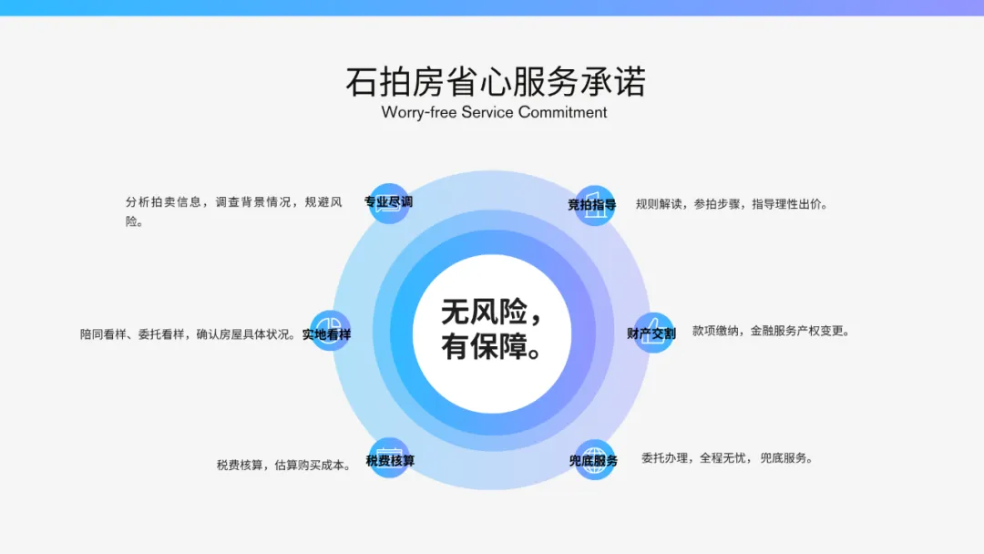 鉴于法拍房市场风险复杂,买家往往难以察觉潜在隐患,也缺乏解决风险的能力,因此更需要多加注意。石拍房,可为您提供法拍一站式服务。无论您是个人还是公司购房,是自住需求还是投资考量, 我们都能依据您的预算和实际情况,精准推荐优质房源标的,石拍房将对标的物进行全面评估,助您安心省心置业。