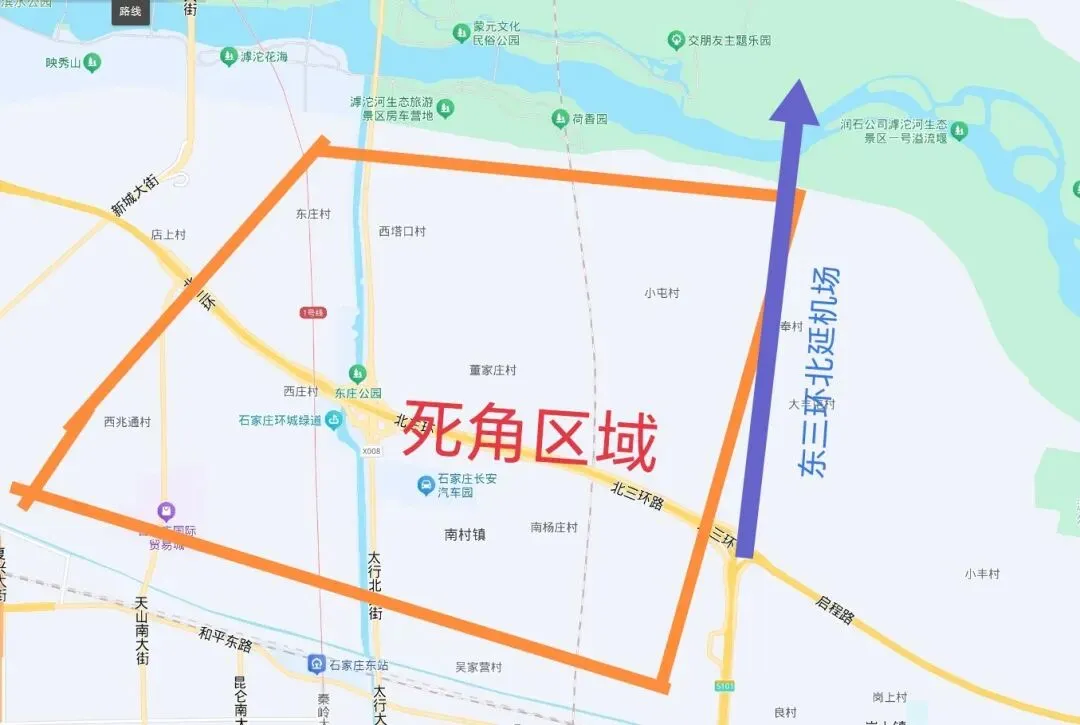 滹沱河南岸由此形成了一个大的死角,北至滹沱河、南至和平路、西至新城大道、东至东三环北延线。