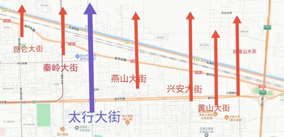 还有友谊大街、泰华街、维明大街、翟营大街、谈固大街、谈固东街、珠峰大街、天山大街、昆仑大街、秦岭大街、燕山大街、兴安大街、黄山大街、阿里山大街等,这些路一股脑被挡在了滹沱河南岸,甚至像昆仑大街、秦岭大街这样的主干道连石德铁路、石津灌渠都没过去,高新区只有太行大街跨过了滹沱河。