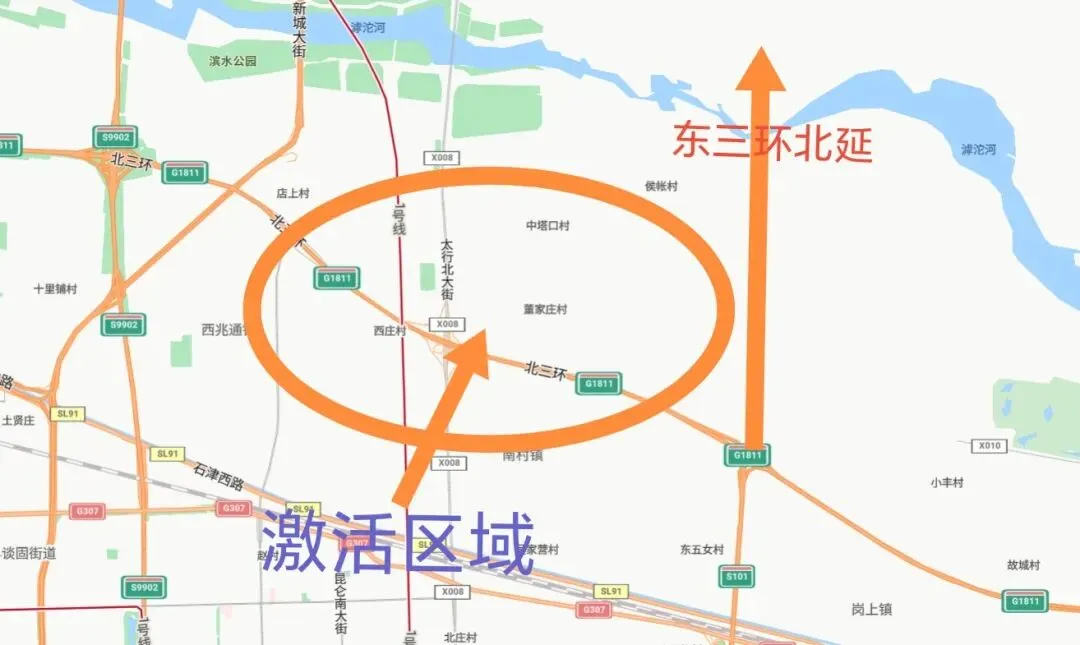 再者东三环北延至机场,新增一座跨滹沱河大桥,加之已跨河的太行大街,基本可满足南北两岸通勤需求。