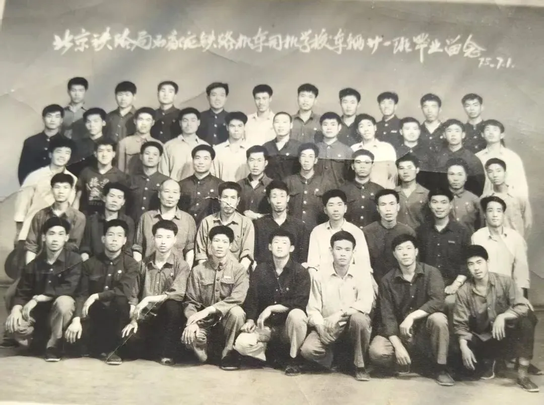 石家庄铁路司机学校车辆班同学毕业合影。三排左五为作者。