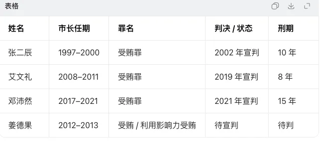 简单做个总结吧,1990年-2026年,26年时间,11位市长,4人涉嫌犯罪入狱,其余升迁省里。