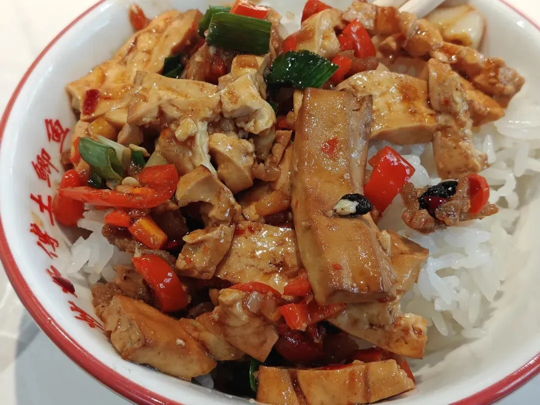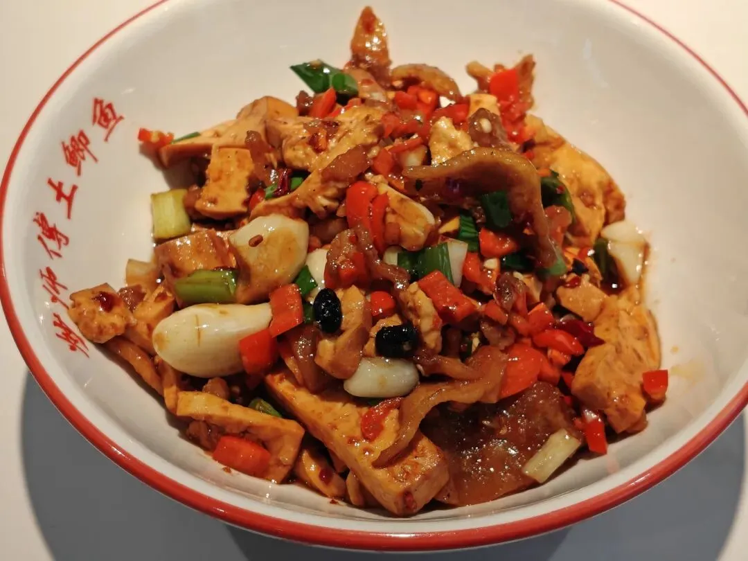 炒香干,这个是让我有点吃惊,有锅气,香辣下饭,油而不腻,除了豆干,有类似油梭子的小猪肉块,其他还有蒜苗、蒜瓣以及红甜椒(疑似)。