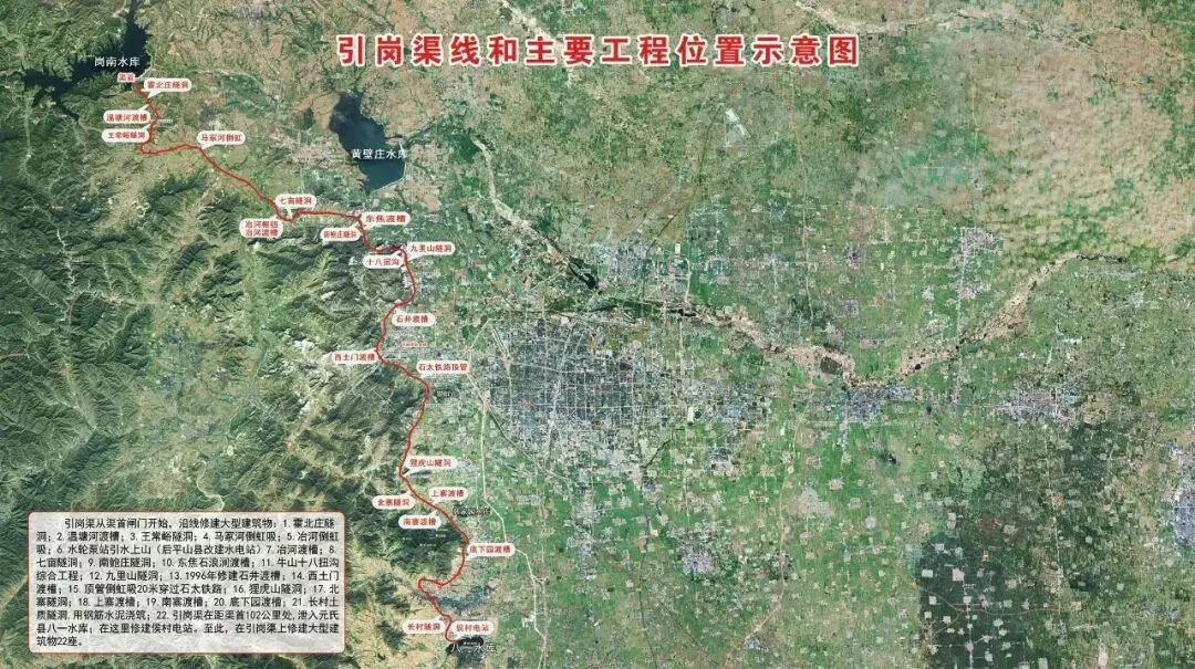 引岗渠由原获鹿县倡议,平山、元氏两具积极参与共同兴建 ,这条渠穿过五十多座山头,跨过二十多条河流,属于跨流域工程。