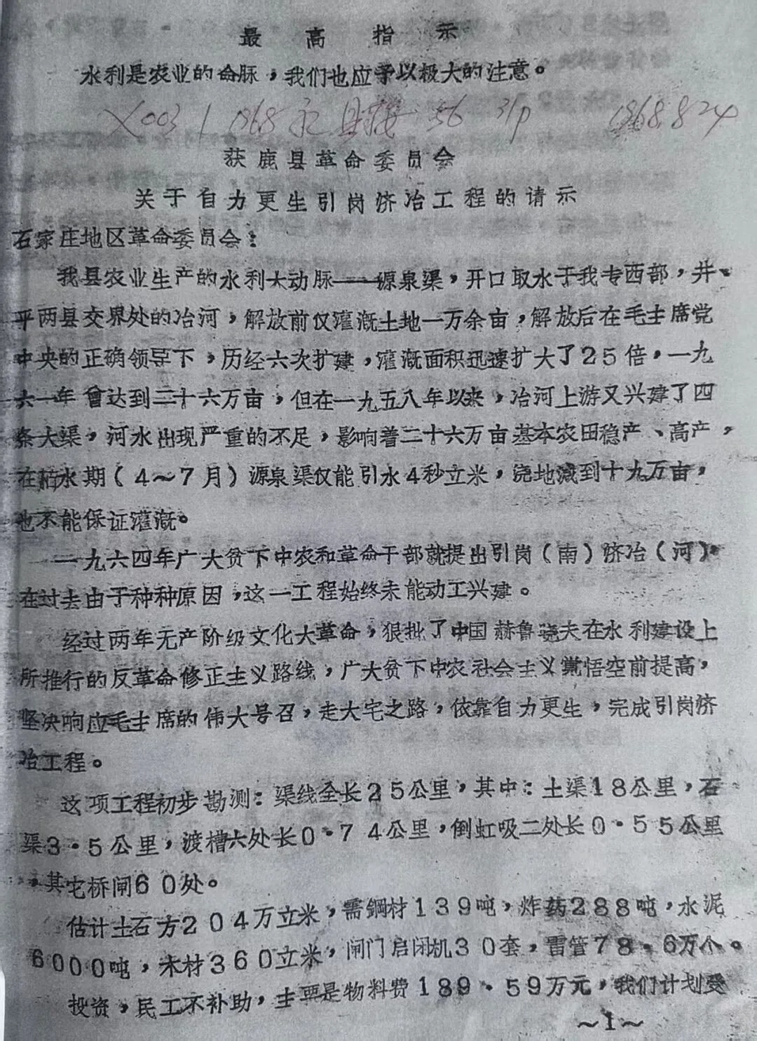 图11.1、获鹿县革命委员会关于自力更生引岗济冶工程的请示,第1页。