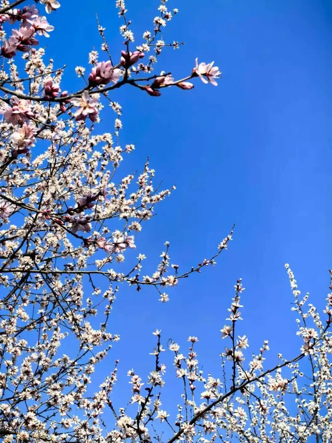 就在西三环与振岗路交叉口河东桥北,那片占地6000平方米的山桃花海猝不及防地撞进眼帘。粉白的小花开了一树又一树,它们开得理直气壮,仿佛整个冬天的等待,就为这一场盛大的宣告。每一朵都铆足了劲儿,每一树都拼尽了力,粉白的花朵开满枝头,在蓝天的映衬下,显得格外纯净而梦幻。